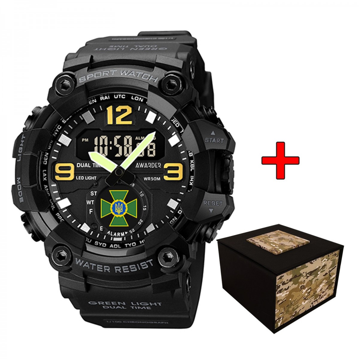 Awarder 003BKDPS оснащен кварцевым механизмом и комбинированным стрелочно-электронным циферблатом, на котором вы найдете индикацию часов, минут, секунд, дня недели и числа. Уникальные функции, такие как будильник, календарь, секундомер и второй часовой пояс обеспечивают максимальный комфорт в использовании.