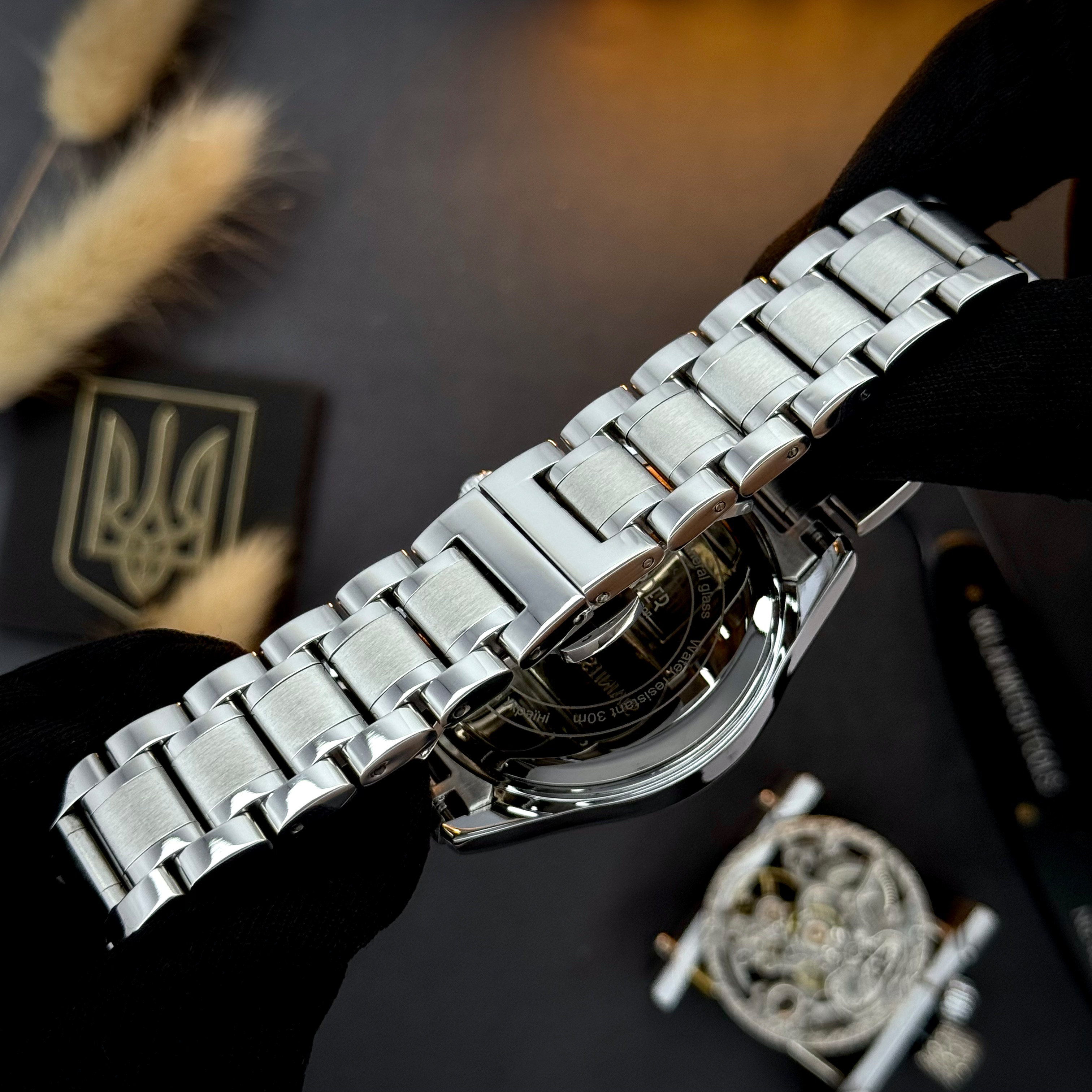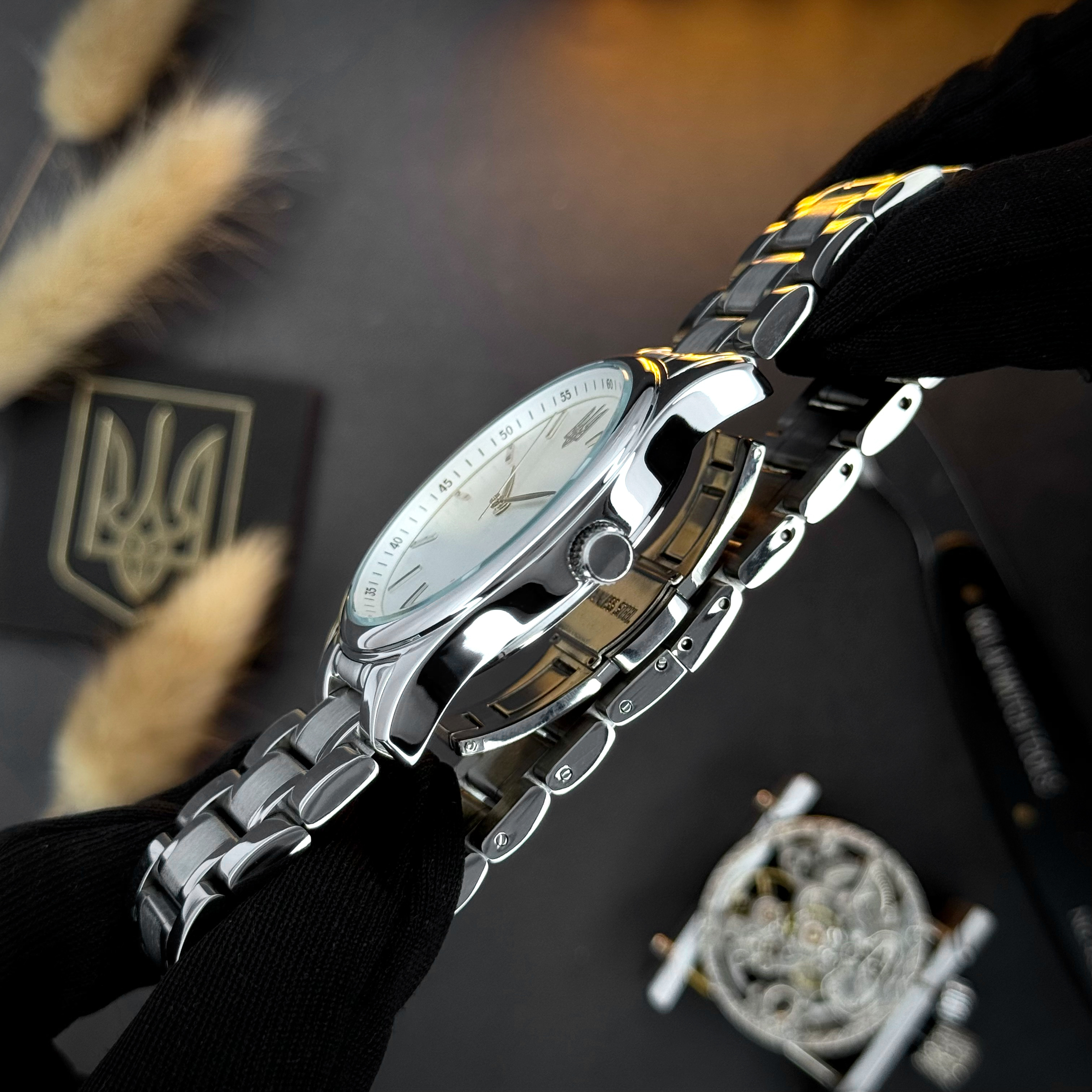 Корпус часов изготовлен из качественного металла серебристого цвета, что придает ему изысканный вид, а надежный браслет из нержавеющей стали обеспечивает комфорт при ношении. Диаметр корпуса составляет 42 мм, а длина ремешка – 25 мм, что делает его универсальным для любой руки.