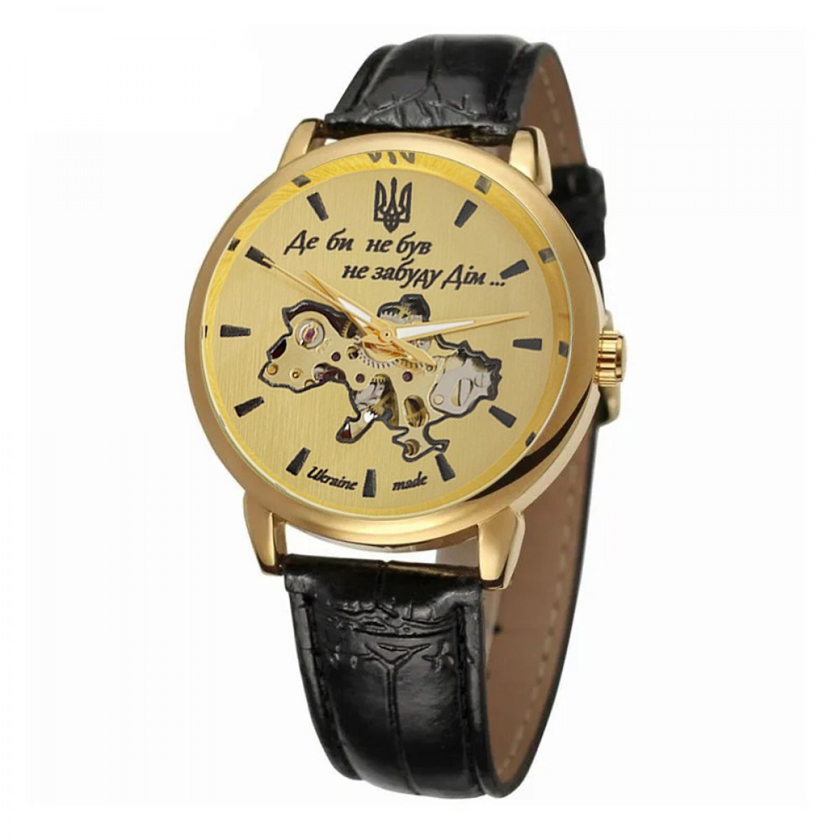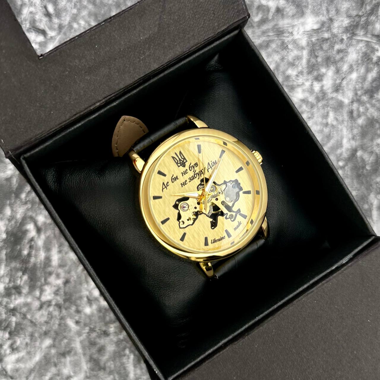На циферблате гордо расположена карта Украины, которая не только указывает на место происхождения этих часов, но и становится изысканным художественным выражением национальной идентичности. Если присмотреться внимательно, вы заметите видимый механизм скелетона, изящно открывающегося под стеклянным куполом, напоминая о внутренней красоте и прозрачности каждого момента.
