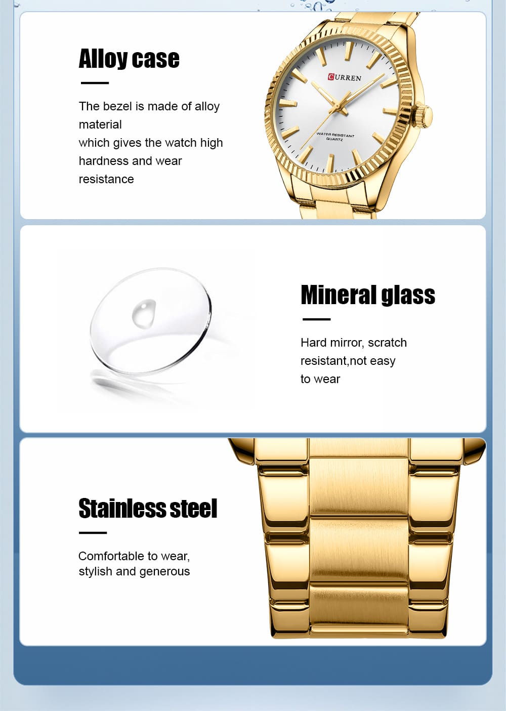 Curren – бренд якісного кварцового годинника з 2001 року. Годинник має стильний дизайн, високу якість складання та офіційну гарантію 12 місяців. Вони підійдуть під будь-який одяг, яскраво виділять власника з натовпу і точно показуватимуть час власнику довгі роки.