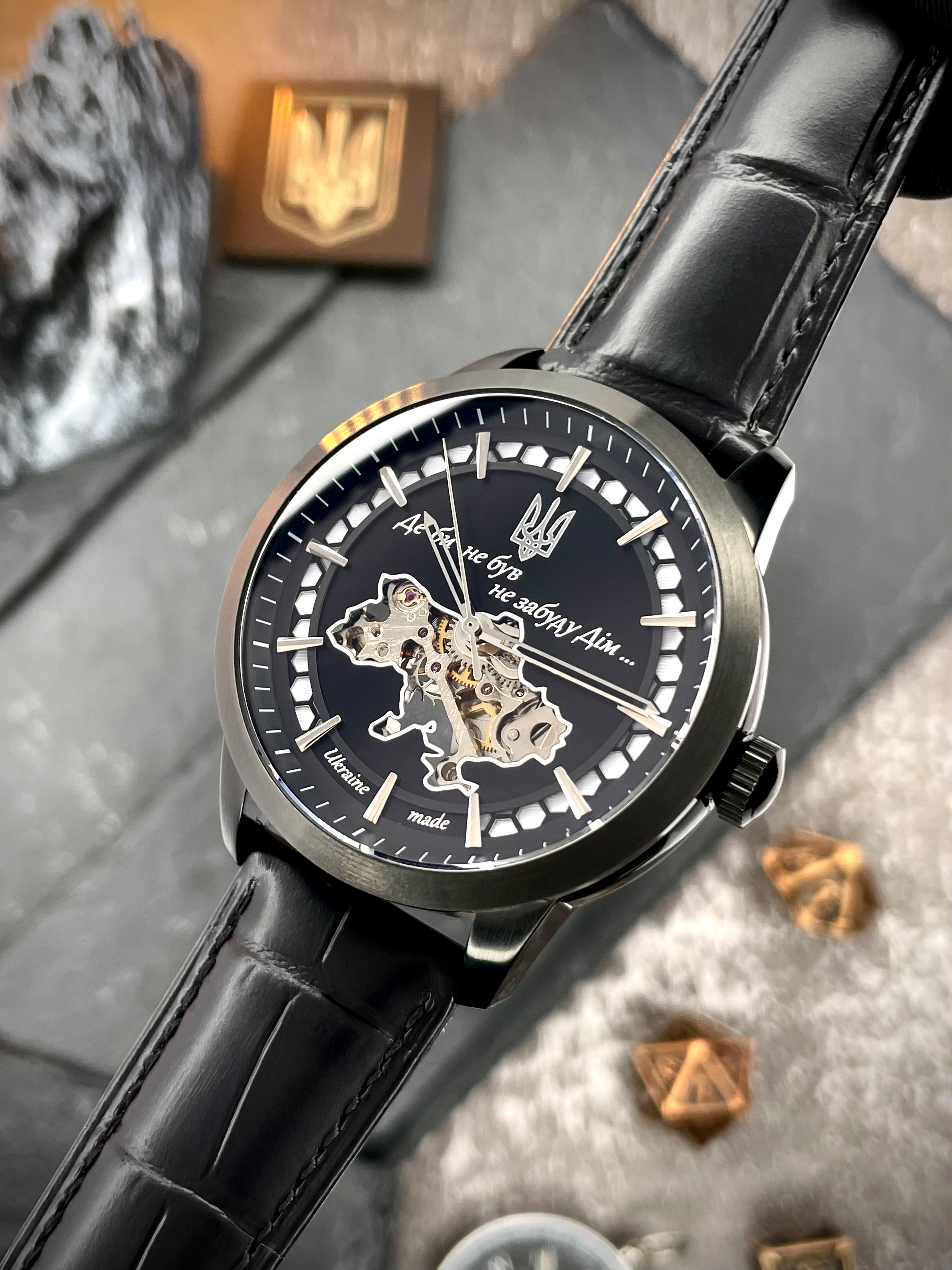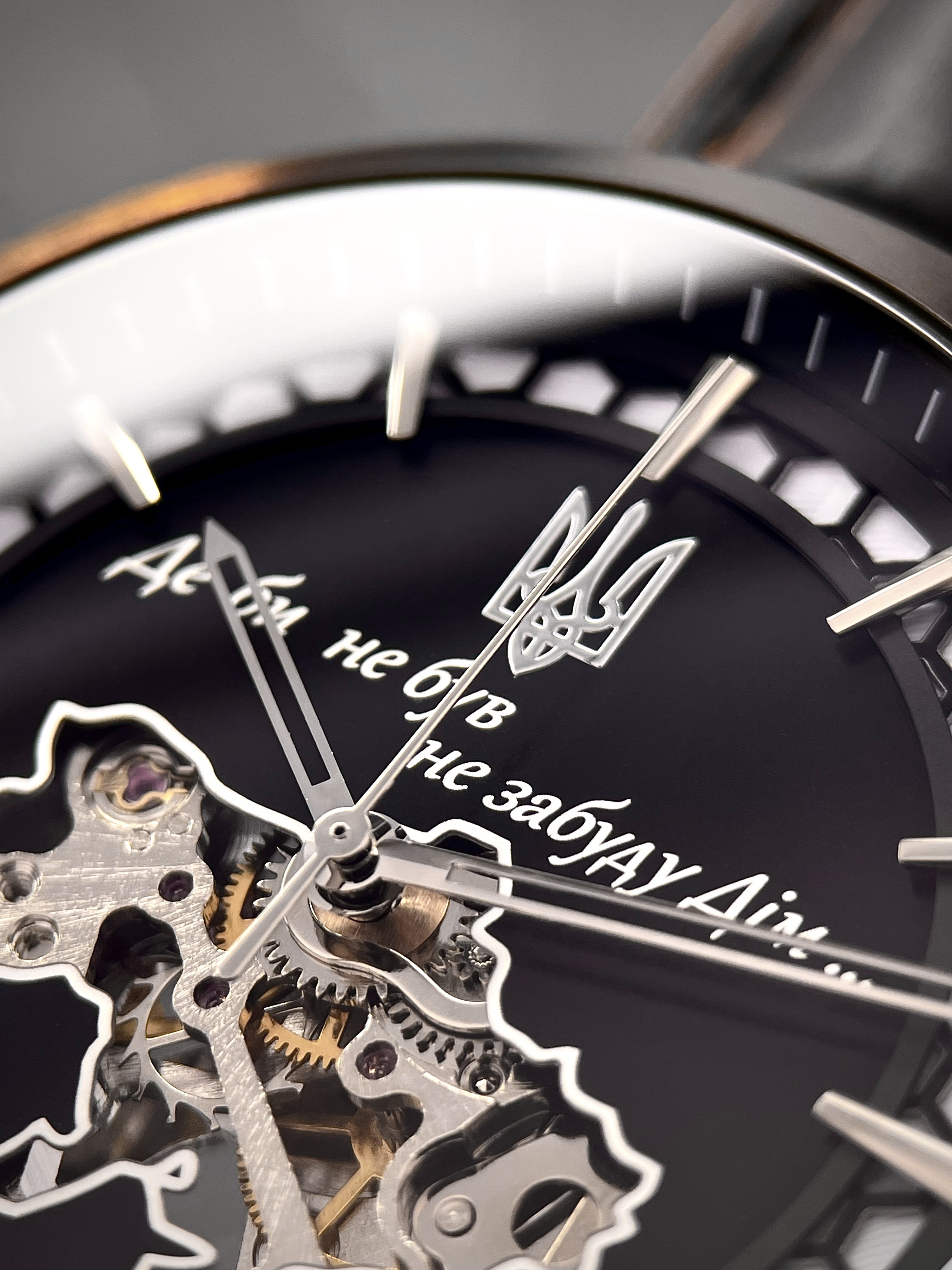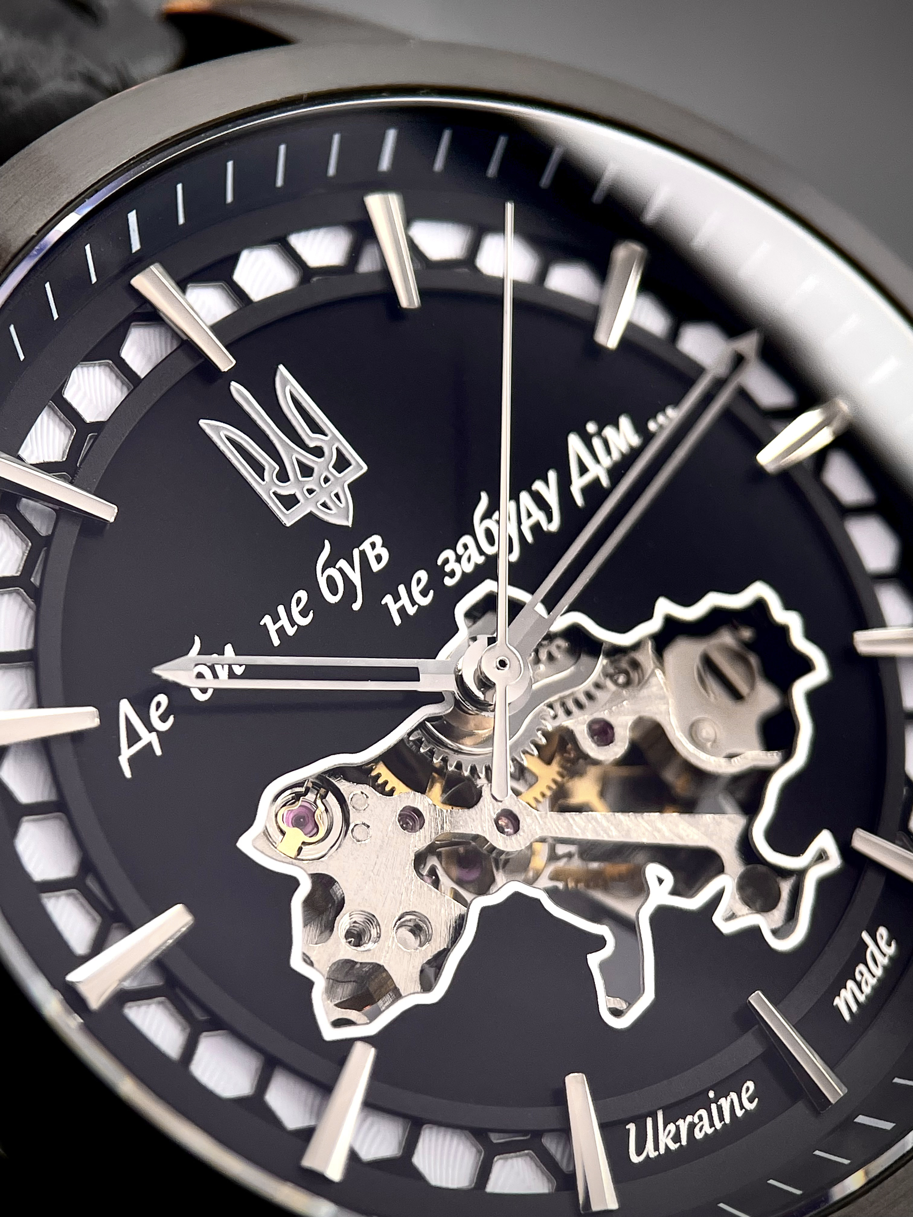 В самом сердце часов — прозрачная карта Украины, через которую виден механический автоподзаводный механизм — надежный, долговечный, собранный вручную. Его энергия – это движение собственника, его ежедневное присутствие. Надпись «Где бы ни был не забуду Дом» , выгравированная на циферблате, дополненная украинским Трезубцем, пробуждает искренние чувства — гордость, боль, надежду.