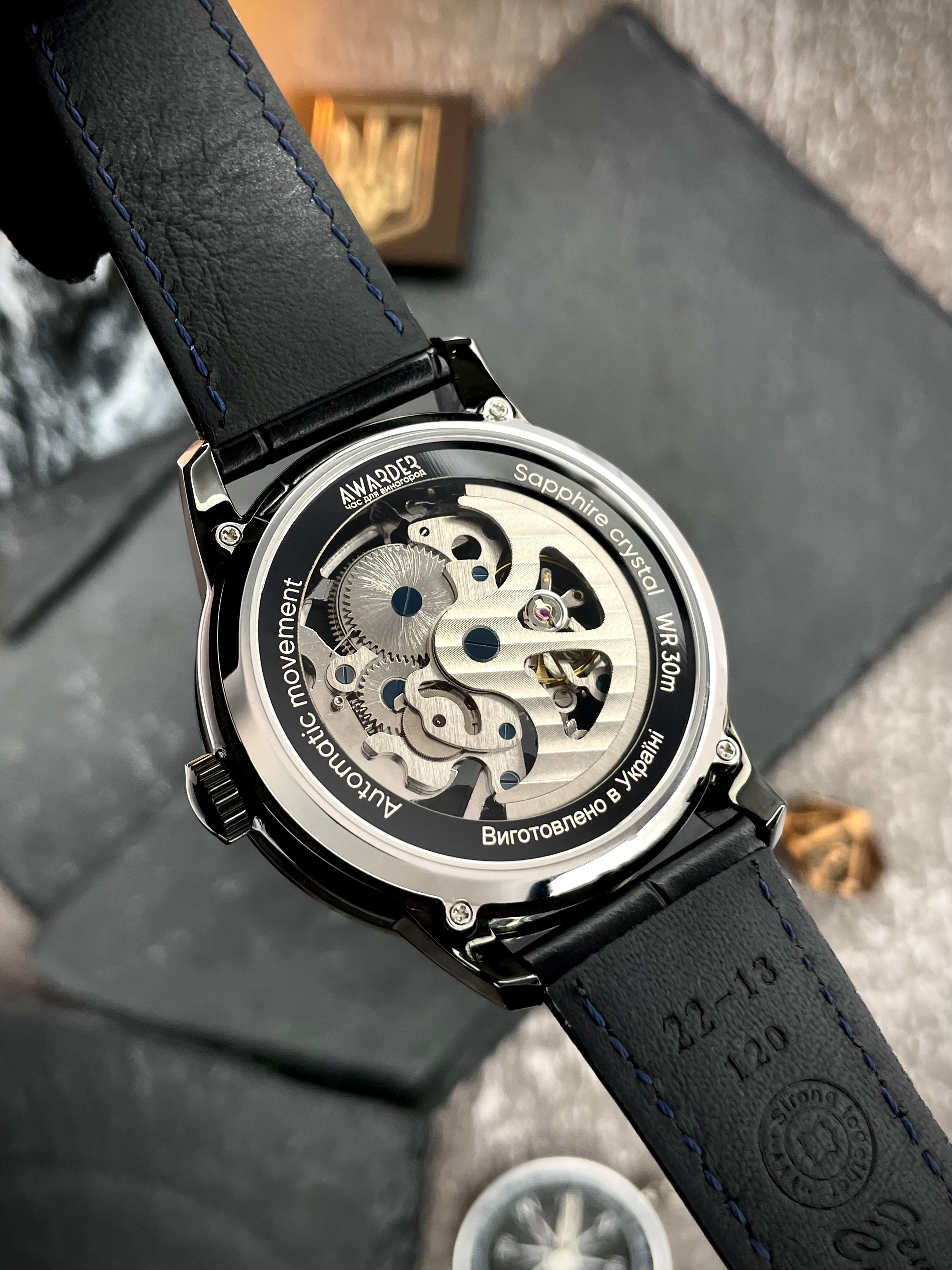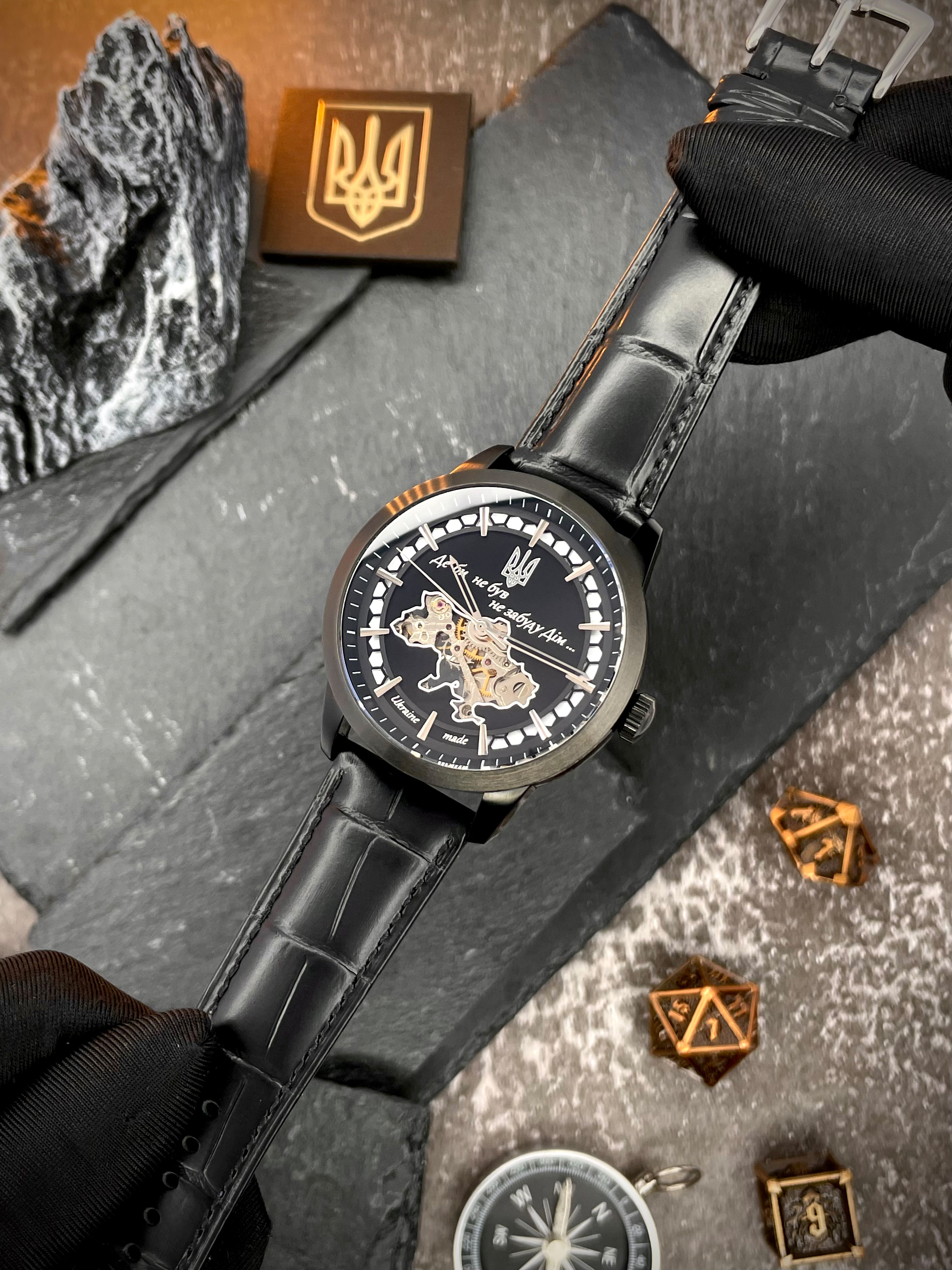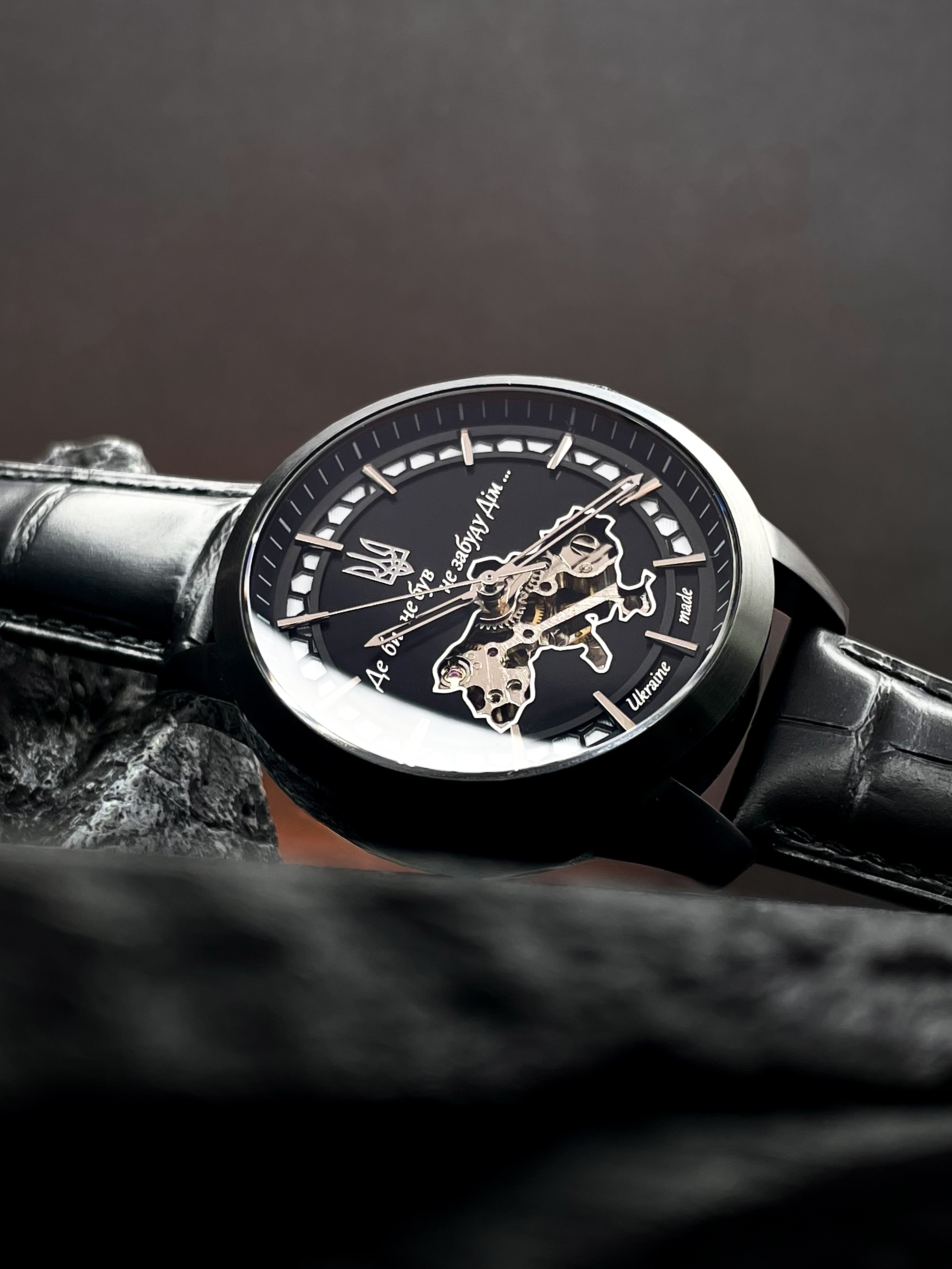 В самом сердце часов — прозрачная карта Украины, через которую виден механический автоподзаводный механизм — надежный, долговечный, собранный вручную. Его энергия – это движение собственника, его ежедневное присутствие. Надпись «Где бы ни был не забуду Дом» , выгравированная на циферблате, дополненная украинским Трезубцем, пробуждает искренние чувства — гордость, боль, надежду.