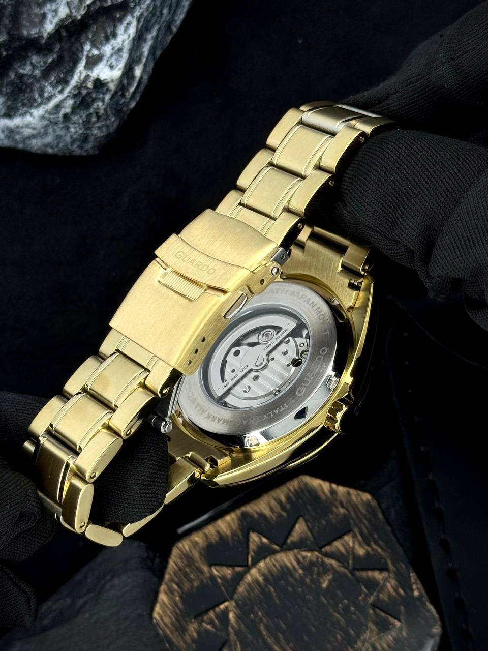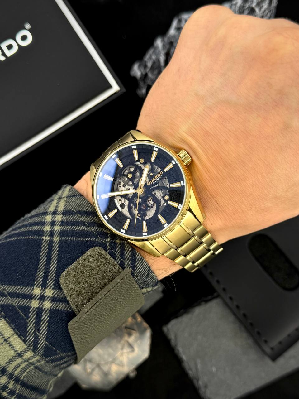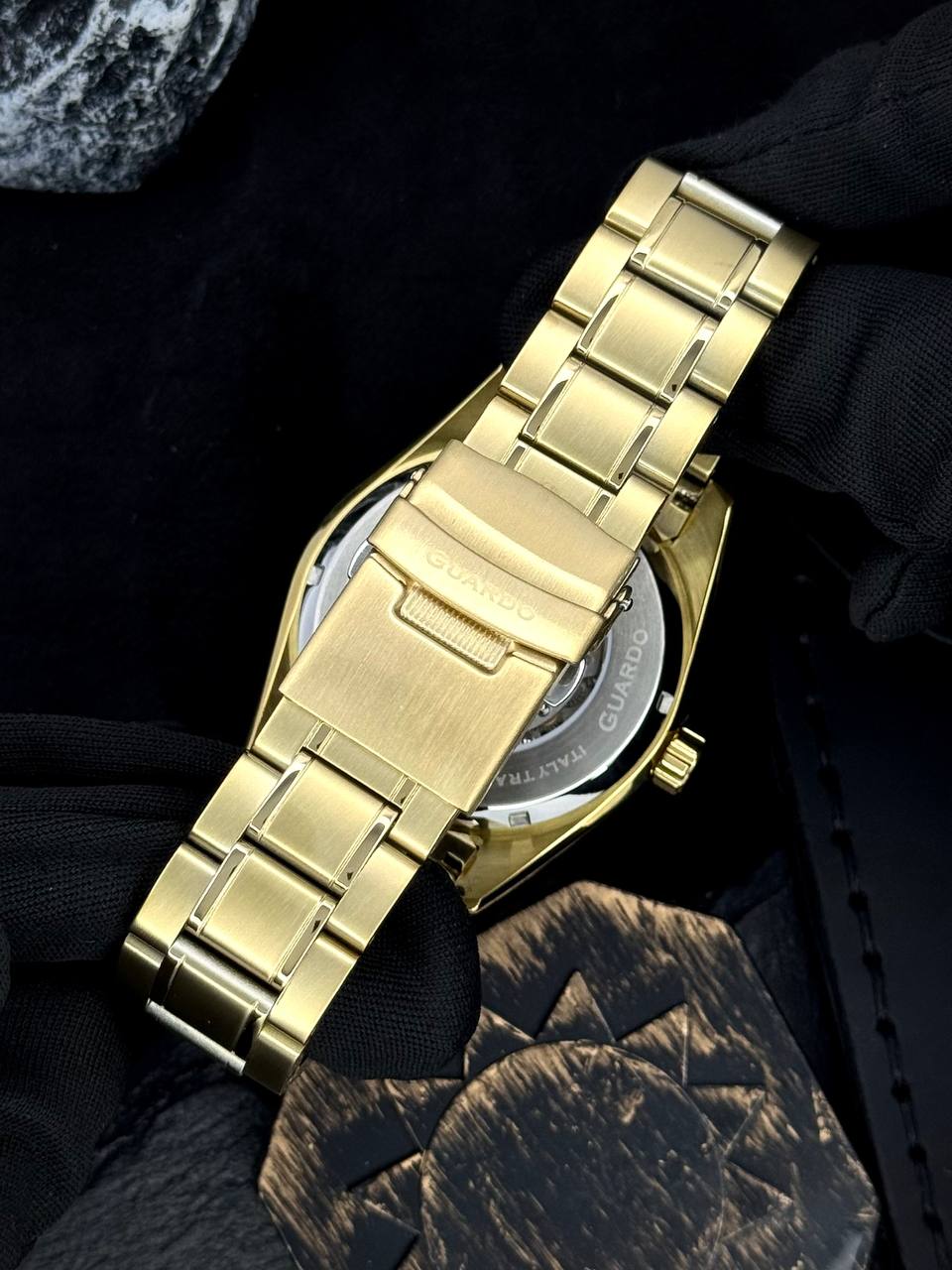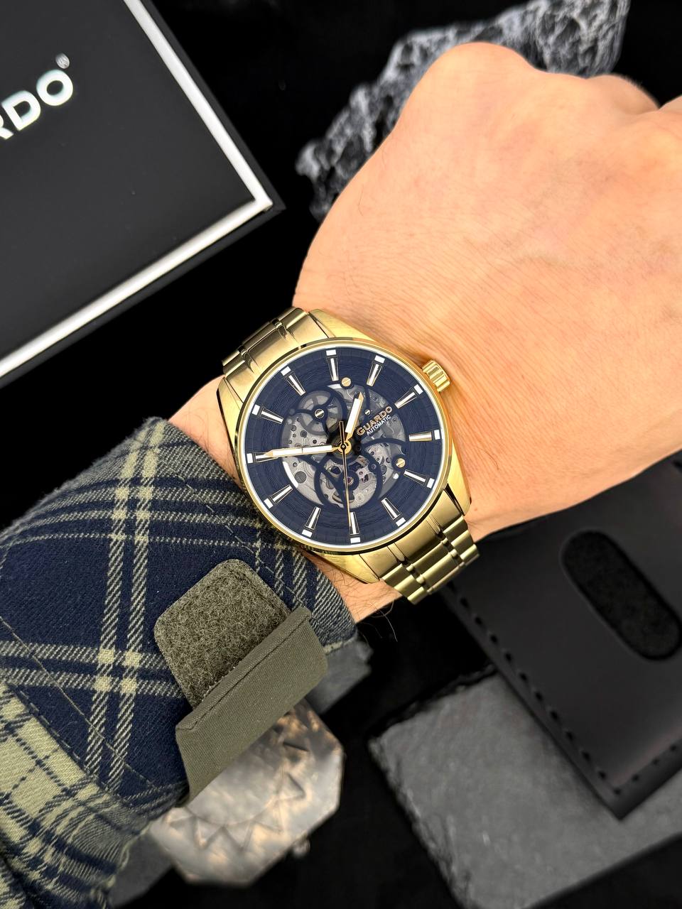 - Дизайн: Золотистый цвет корпуса и ремешка придает часам роскошный вид, а круглая форма корпуса придает классический стиль.