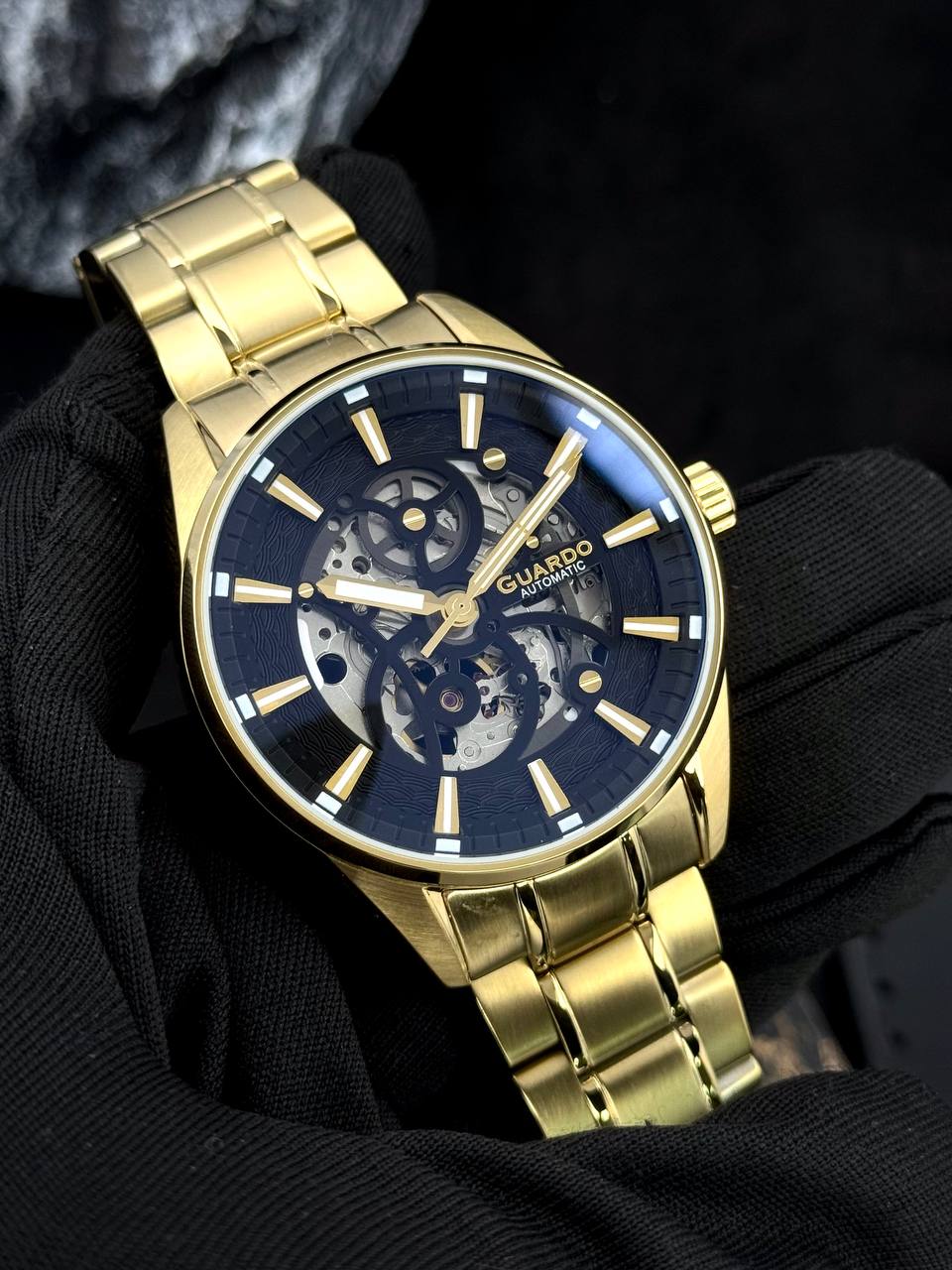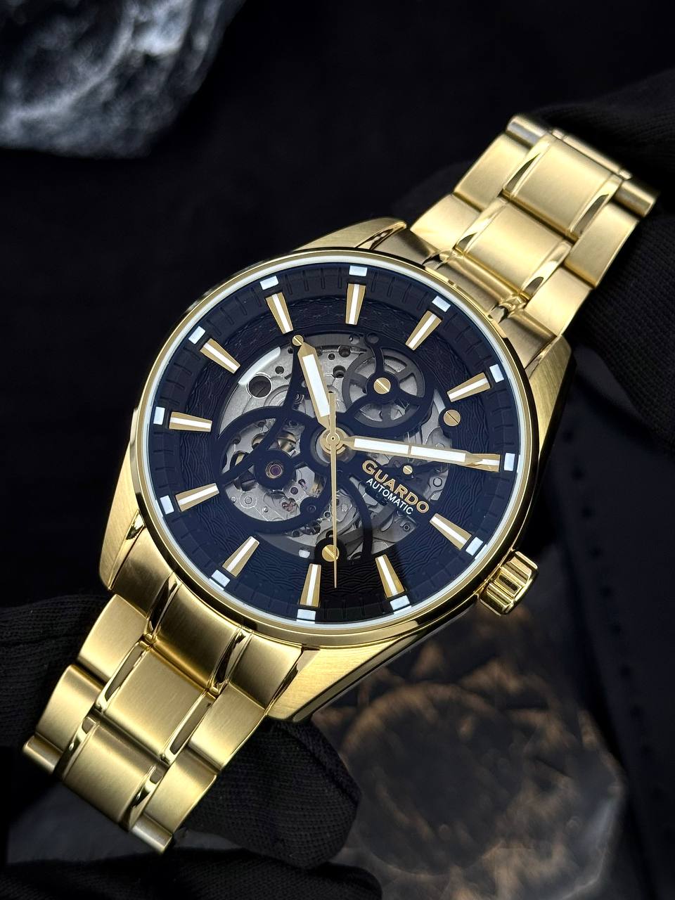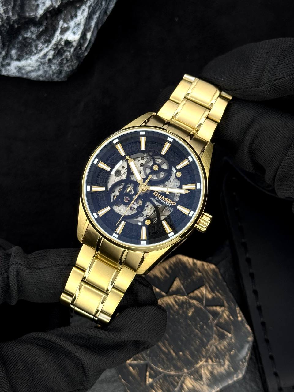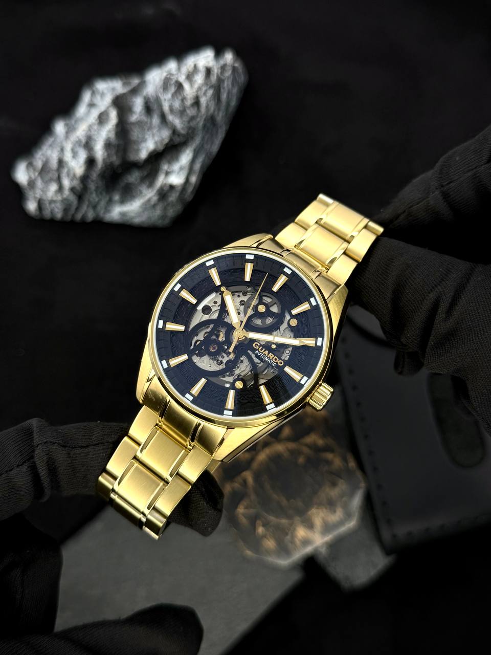 - Дизайн: Золотистый цвет корпуса и ремешка придает часам роскошный вид, а круглая форма корпуса придает классический стиль.