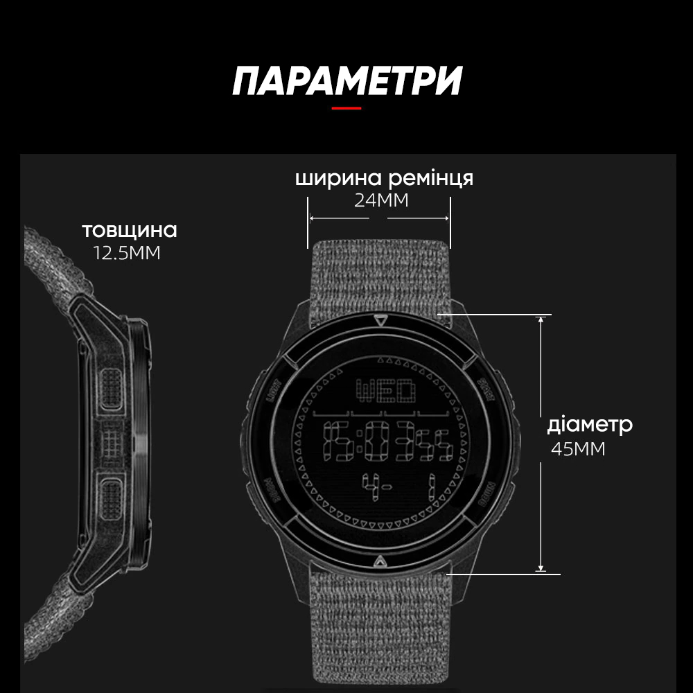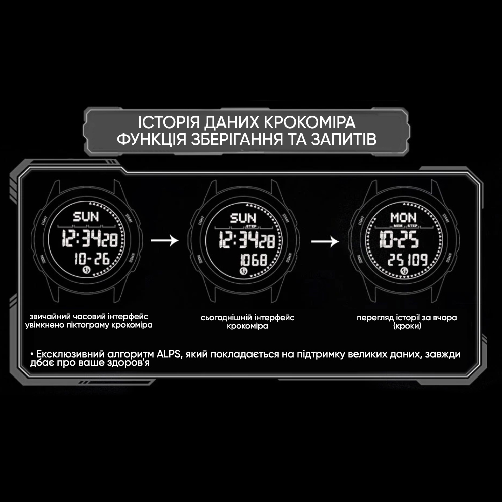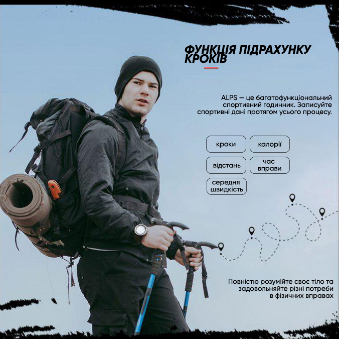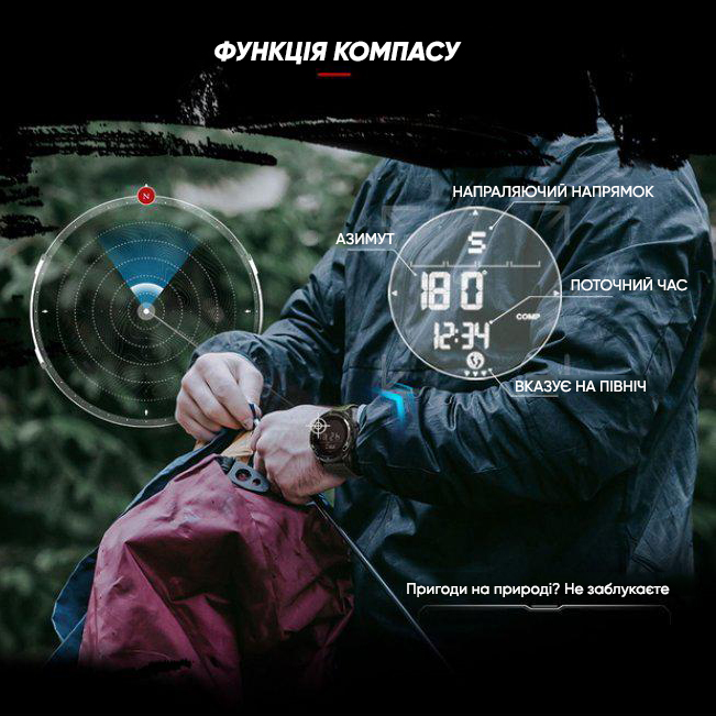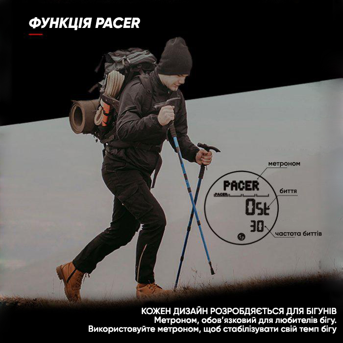| Основные функции | Компас, водостойкость 5 атм, пейсер, педометр, калории, дистанции, секундомер, подсветка, будильник, таймер. |