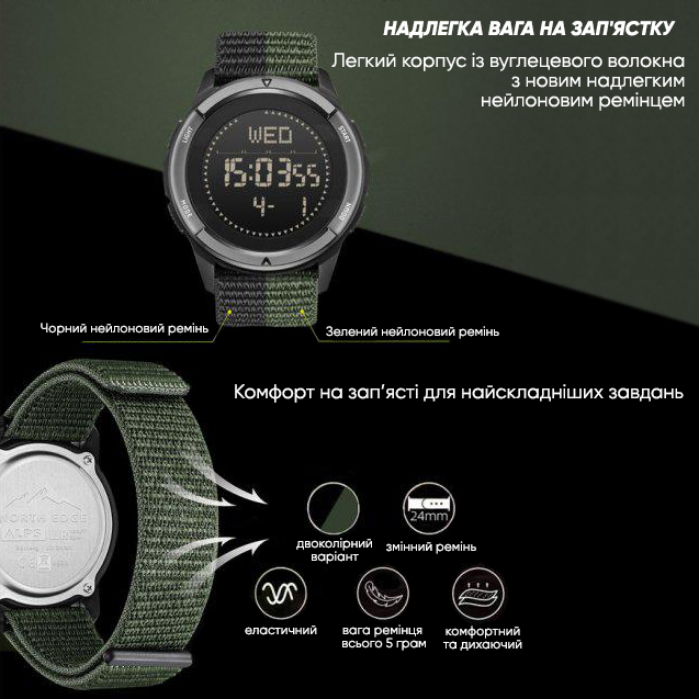 North Edge – бренд тактических часов для пилотов и моряков. Часы предназначены для использования в экстремальных условиях. Они выдерживают 5 метров под водой, ультрахолодные температуры и обладают всем необходимым для любой жизненной ситуации. Бренд North Edge широко ценится и используется моряками и пилотами по всему миру и пользуется репутацией надежных и качественных часов. В Украине представлено впервые, эксклюзивно в нашем магазине. Особенностью модели Alps является корпус из материала карбон Fibre+, выдерживающий большие нагрузки, но при этом мало весящий и обеспечивающий легкость часов. Также большим преимуществом модели является компаса и водостойкость.
