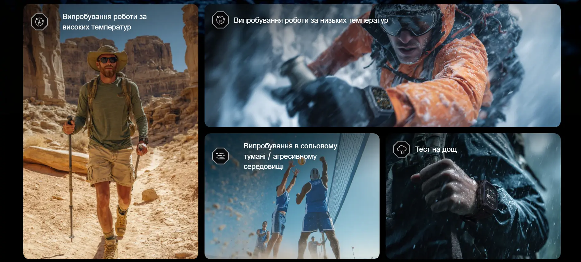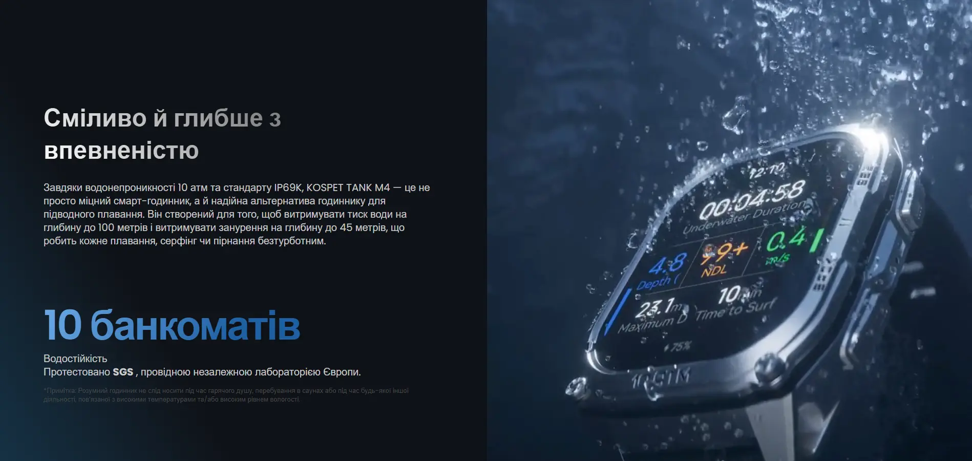 KOSPET TANK M4 – это сочетание прочности, автономности и расширенных навигационных возможностей, созданное для спорта, туризма и активного образа жизни. Часы ориентированы на пользователей, регулярно сталкивающихся с экстремальными условиями: погружение в воду, длительные походы, высокая влажность, перепады температур, удары или вибрация. В основе модели сертификация 10 ATM и IP69K, что гарантирует защиту от высокого давления воды и интенсивного мытья, а также устойчивость к песку, грязи и механическим воздействиям. Это позволяет использовать TANK M4 в морских погружениях, во время тренировок на открытом воздухе и в средах, где традиционные смарт-часы часто выходят из строя.