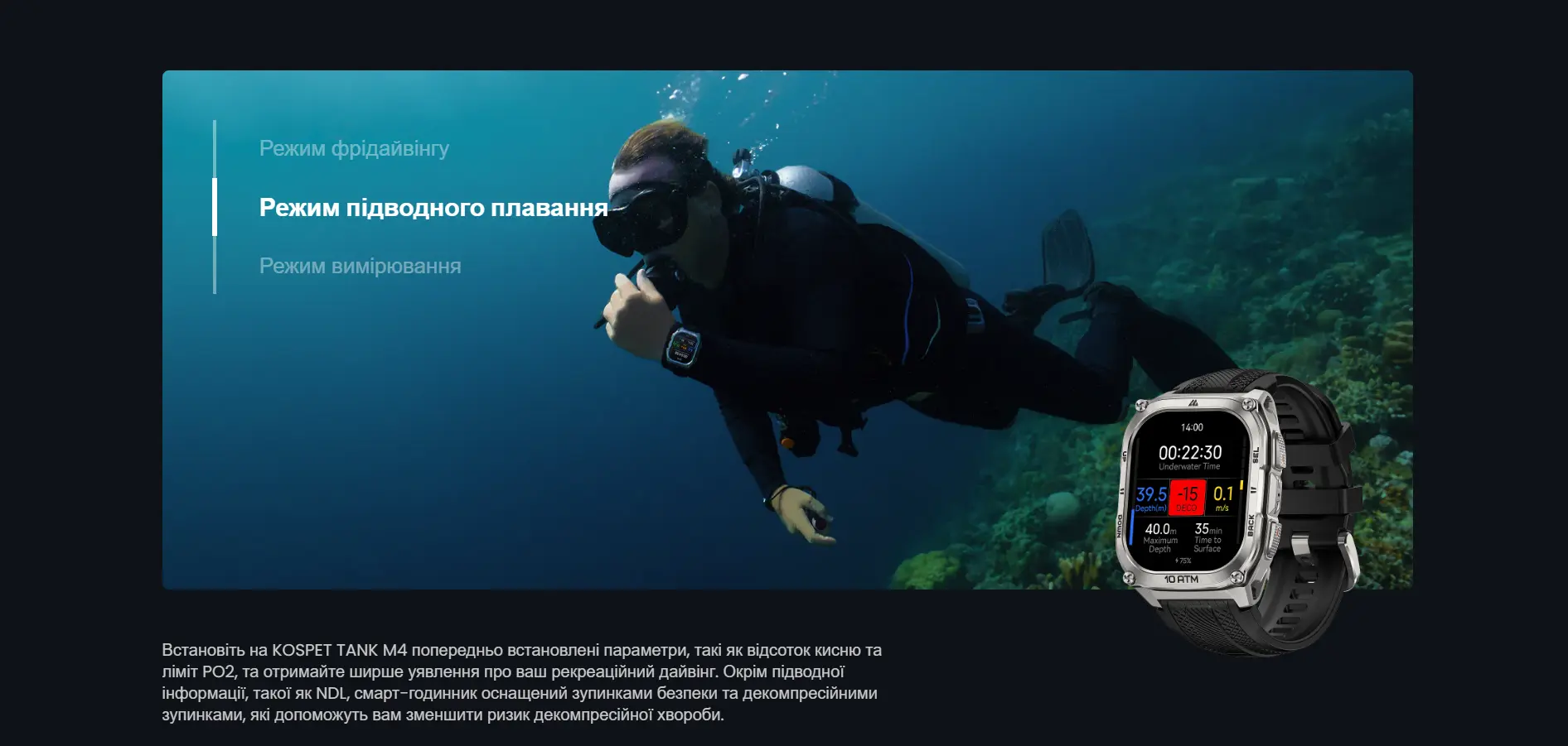 TANK M4 поддерживает три режима погружения, которые анализируют глубину, температуру и изменение давления, а также корректируют поведение интерфейса при нахождении под водой. Это полезно не только для любителей дайвинга, но и для тренировок в бассейне, снорклинге и открытой воде. Часы сохраняют работоспособность даже во время многократных циклов погружения и повышенных нагрузок.