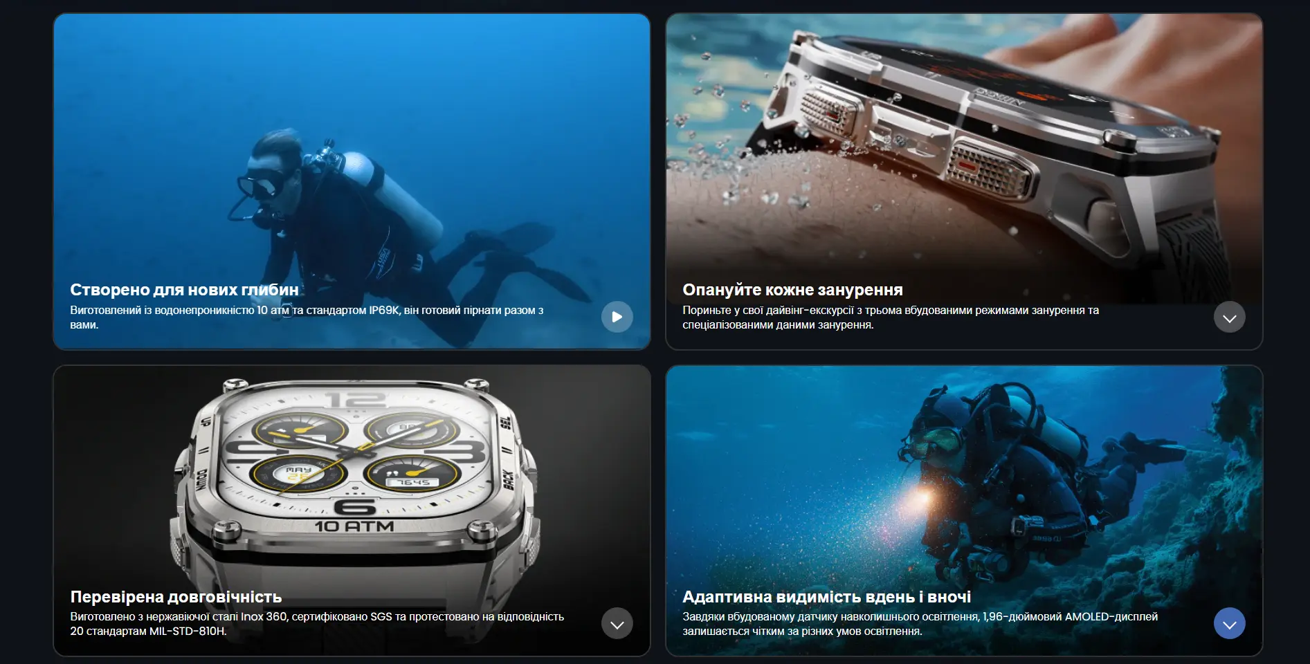 | Спортивные режимы | 24-часовое отслеживание активности (калории, шаги, дистанция), 23 режима ApexMotion + более 160 случайных тренировок, фридайвинг, режим погружения с аквалангом, манометрический режим (Gauge),персонализированные планы тренировок |