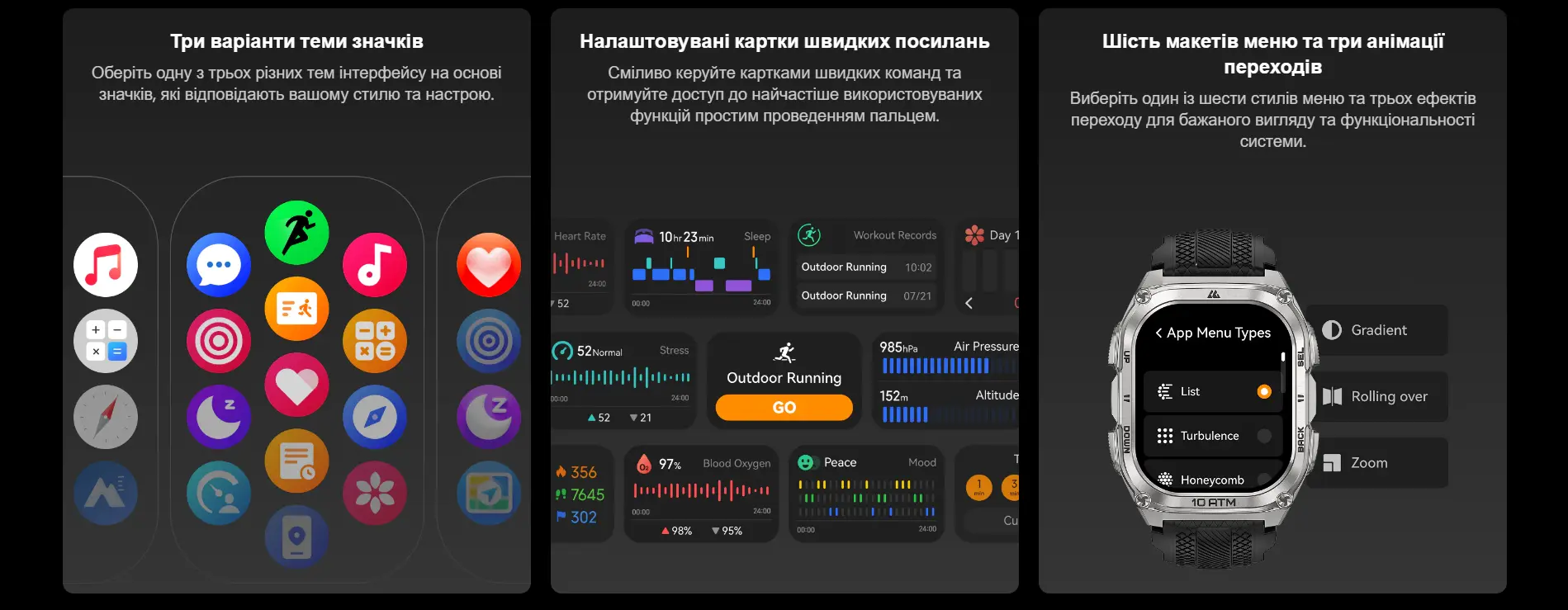 | Беговые режимы | Дистанция, средний темп, средняя частота шагов: да, навигация в реальном времени, отслеживание маршрута, мониторинг сердечного ритма, зоны сердечного ритма |