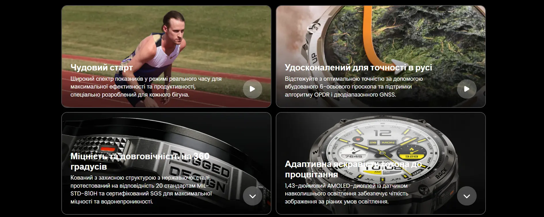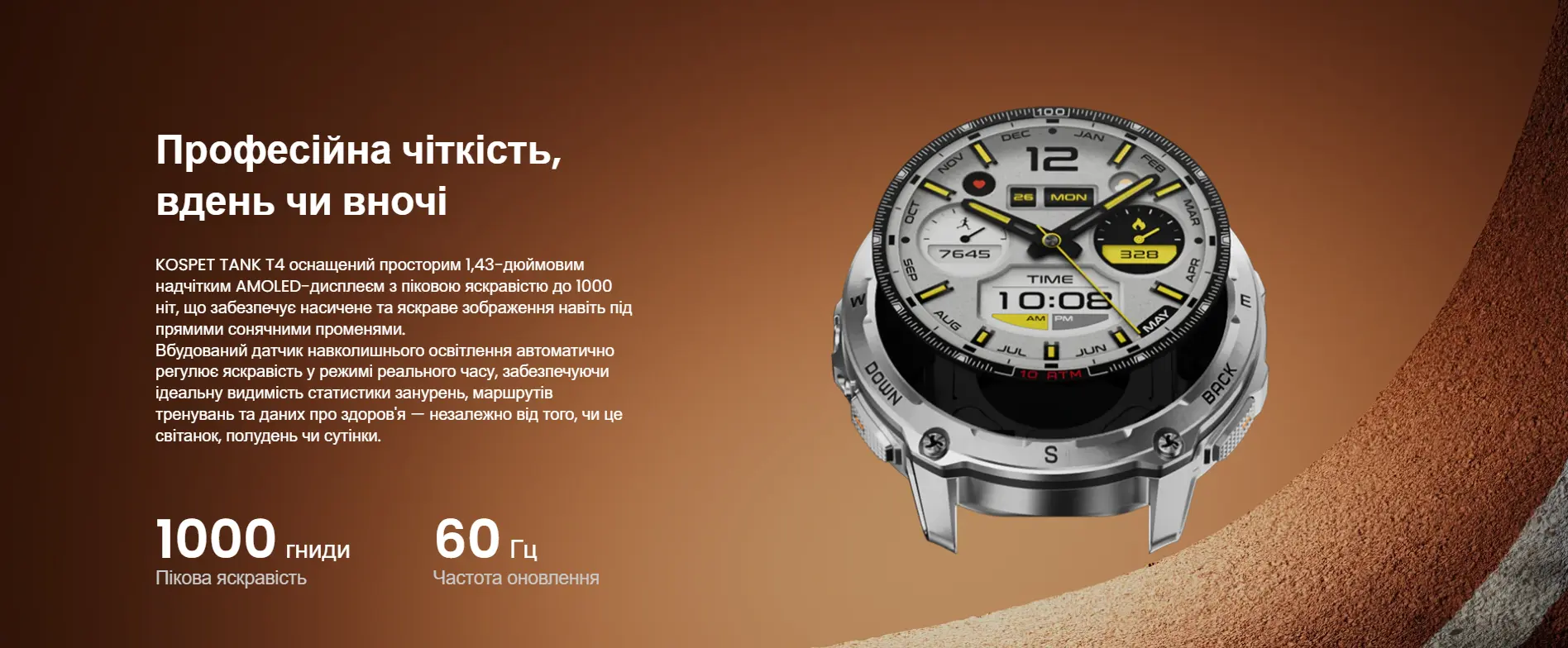 TANK T4 оснащен 1.43-дюймовым AMOLED-дисплеем, отличающимся высокой контрастностью, насыщенными цветами и широкими углами обзора. Автоматическая регулировка яркости адаптирует экран к окружающему освещению – от прямого солнца до тьмы и подводной среды. Такое качество отображения упрощает навигацию, просмотр карт, мониторинг здоровья и спортивные показатели даже во время интенсивного движения.