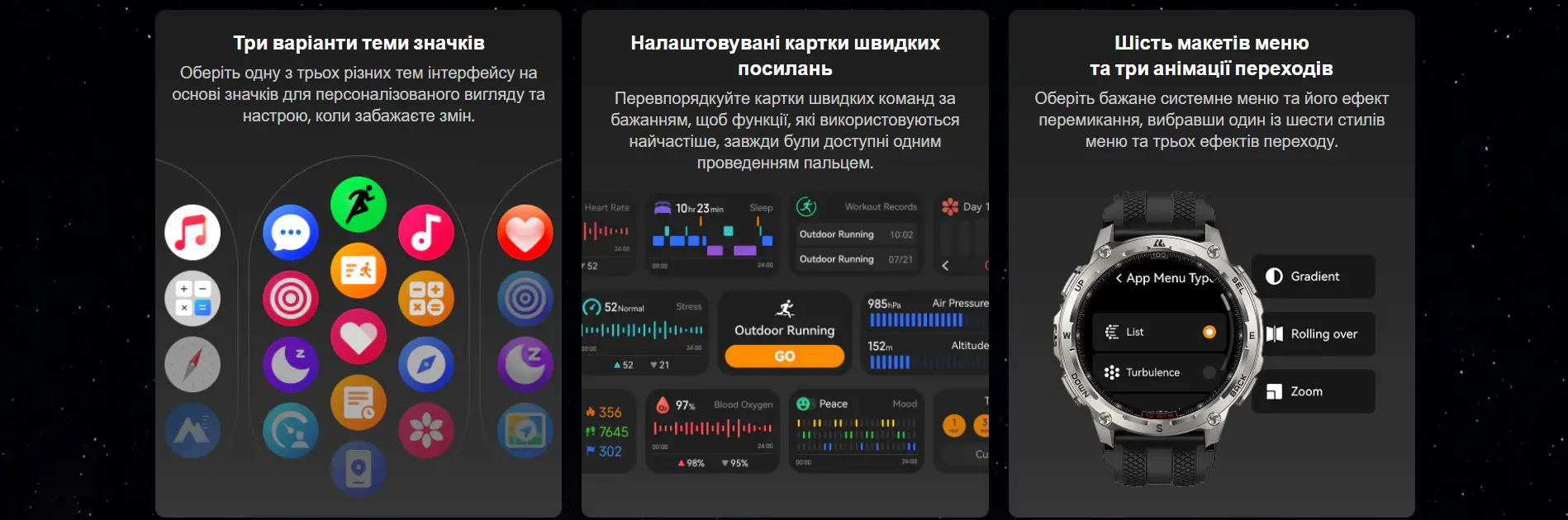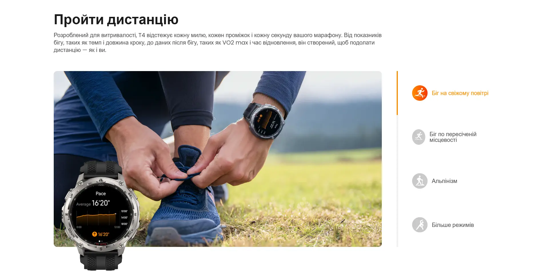 | Беговые режимы | Дистанция, средний темп, средняя частота шагов: да, навигация в реальном времени, отслеживание маршрута, мониторинг сердечного ритма, зоны сердечного ритма |