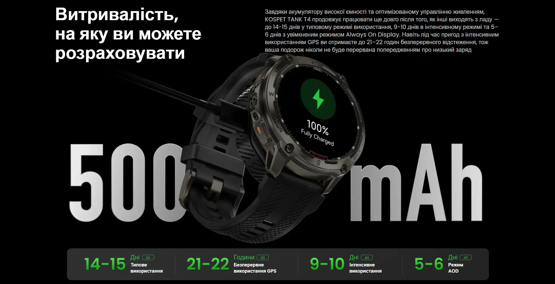 Благодаря батарее емкостью 500 мА·час смартчас работает длительное время без подзарядки даже с активными сенсорами и GNSS. Это делает TANK T4 Black надежным партнером в многодневных поездках, горных маршрутах, туристических экспедициях и длительных тренировках.