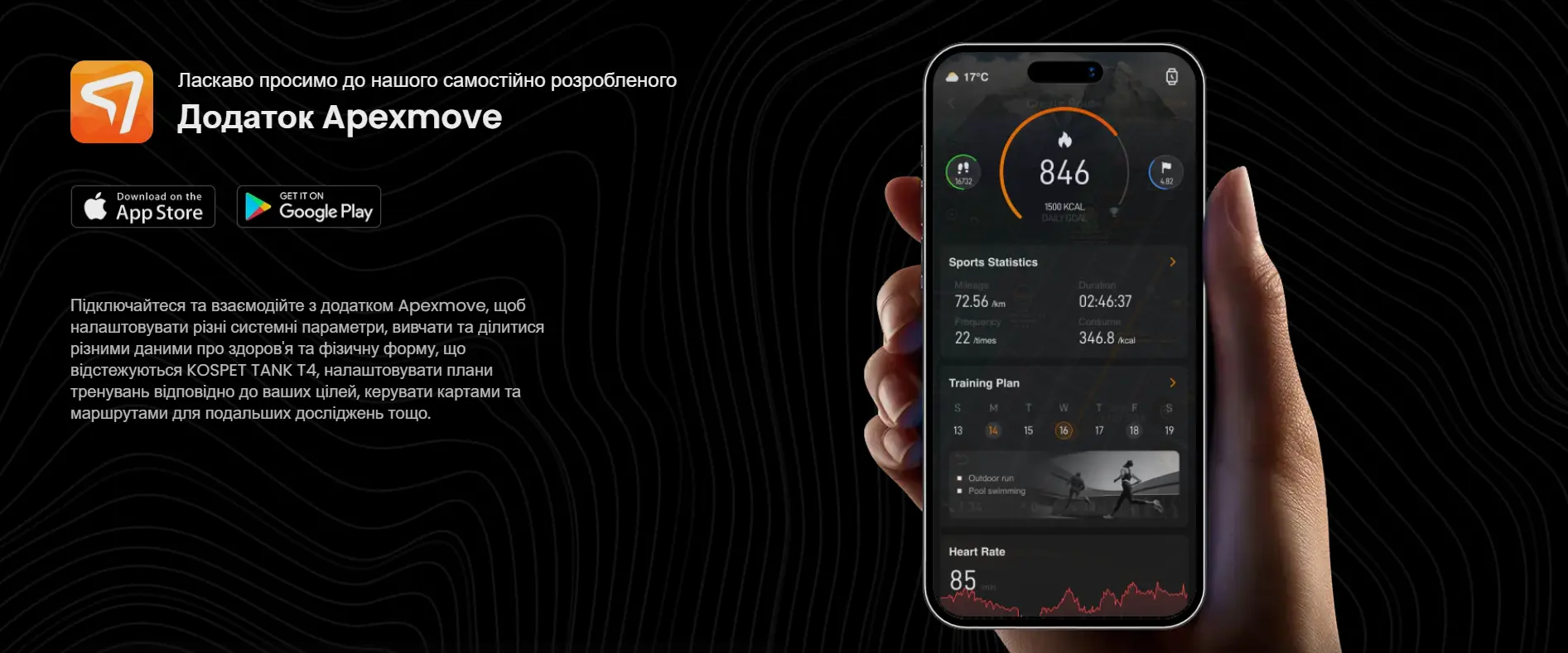 Пользователи KOSPET могут выбрать один из двух вариантов рабочего приложения: классический KOSPET FIT ( Google Play или Apple Store ), или новый – Apexmove ( Google Play или Apple Store ).