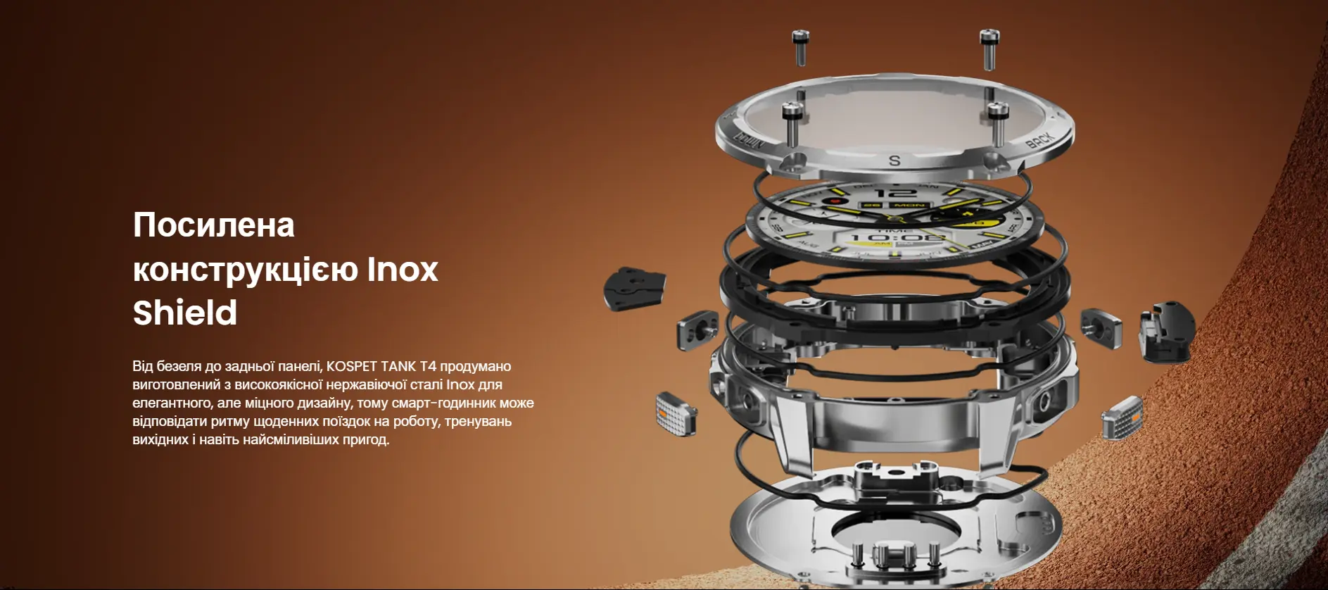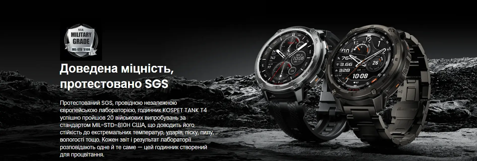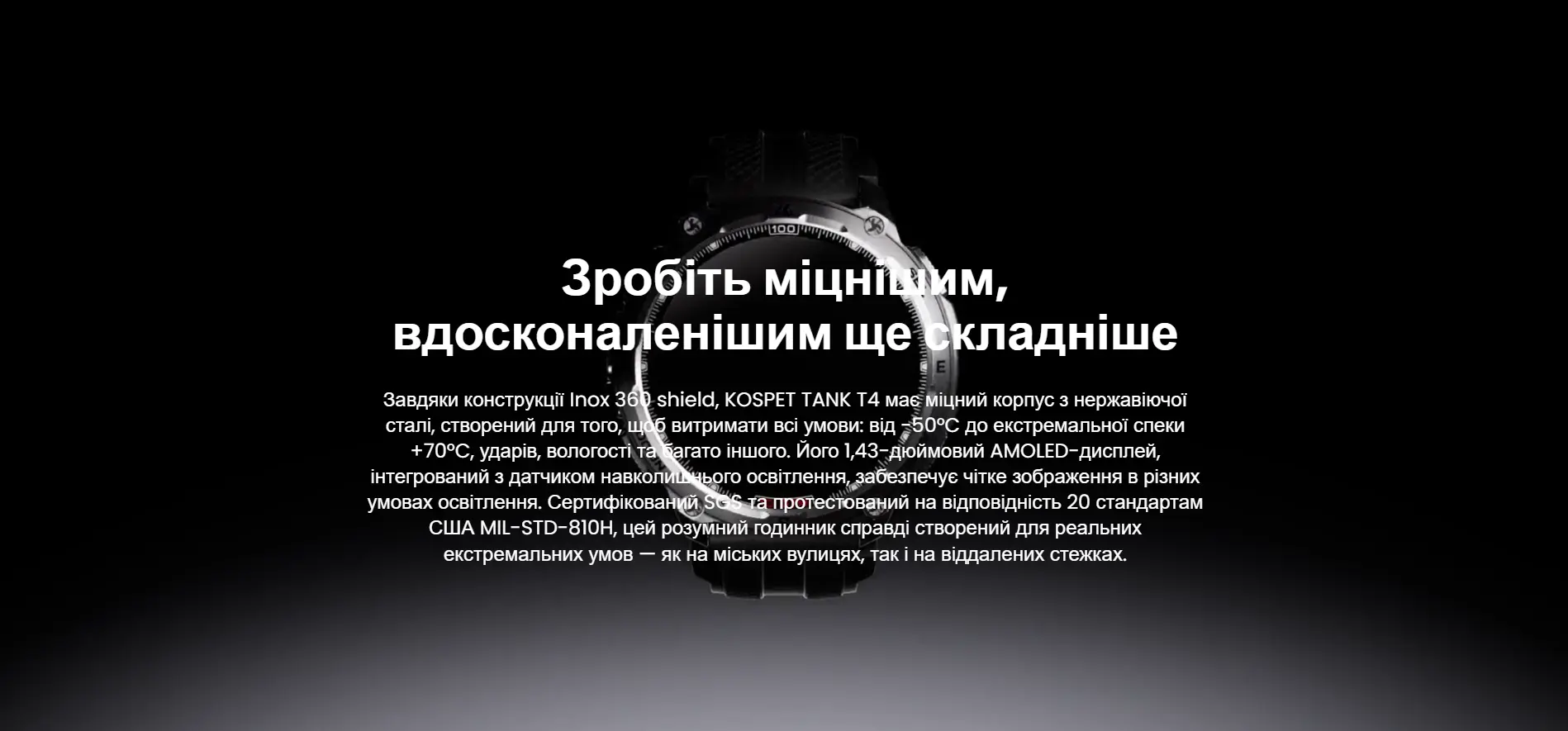 KOSPET TANK T4 Black создан как инструмент для пользователей, двигающихся дальше за пределы города и тренирующихся в сложных условиях. Он объединяет военный уровень прочности, точную навигацию, длительную автономность и функции, полезные во время активных походов и спортивных маршрутов. Корпус изготовлен из нержавеющей стали Inox 360 и сертифицирован по стандарту MIL-STD-810H, что гарантирует устойчивость к ударам, падениям, вибрациям, песку и перепадам температур. Благодаря классу защиты 10 ATM и IP69K смартчасы выдерживают погружение, контакт с соленой водой и активные тренировки в любую погоду.