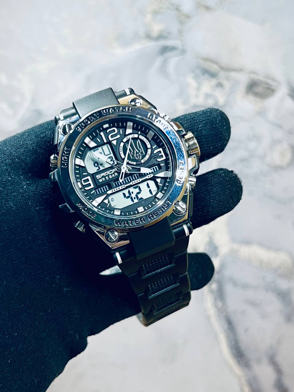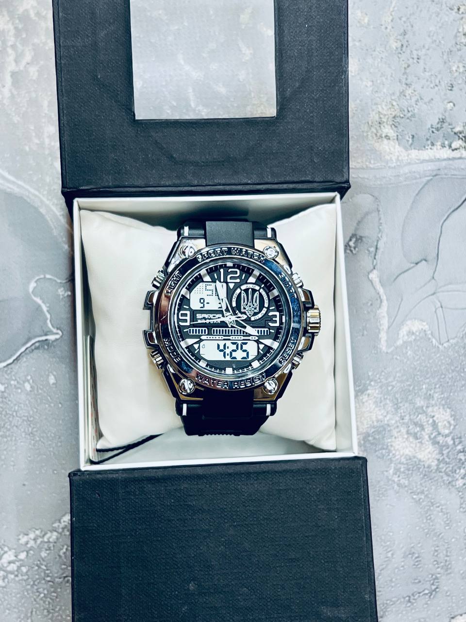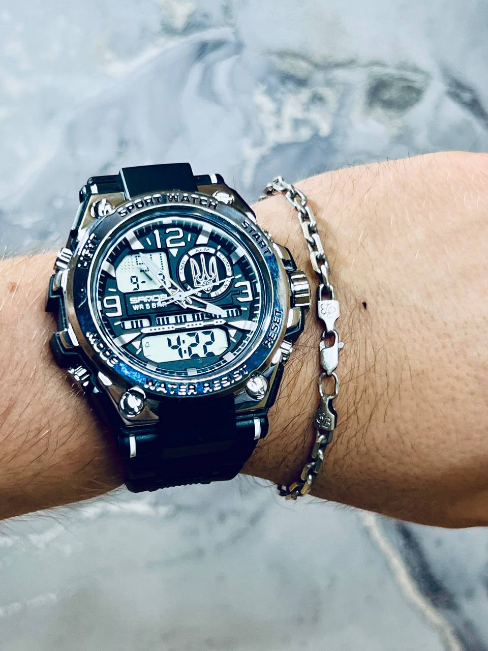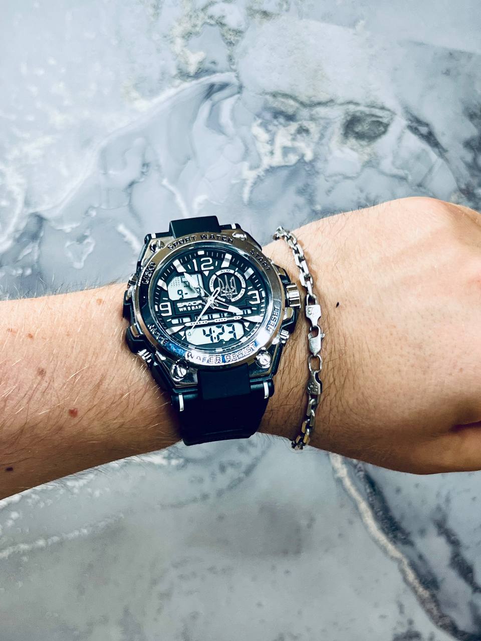 Функциональная модель для мужчин, предпочитающих активный ритм жизни, выполнена с комбинированным типом циферблата. В процессе эксплуатации все элементы: время, минута, секунда, дата, день недели, месяц, секундомер, таймер, будильник, подсветка работают бесперебойно.
