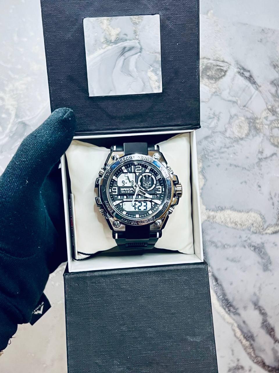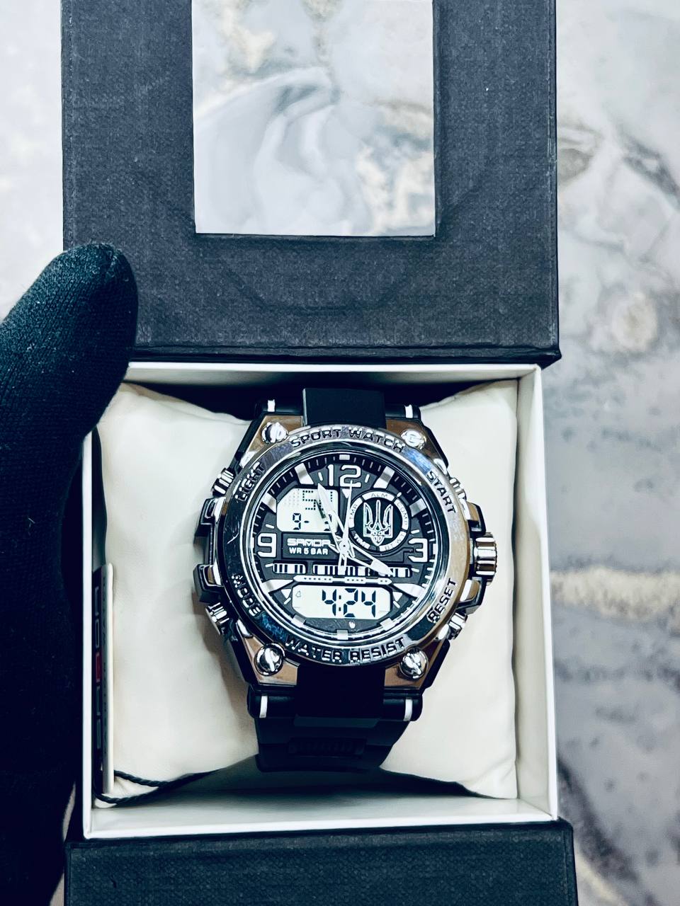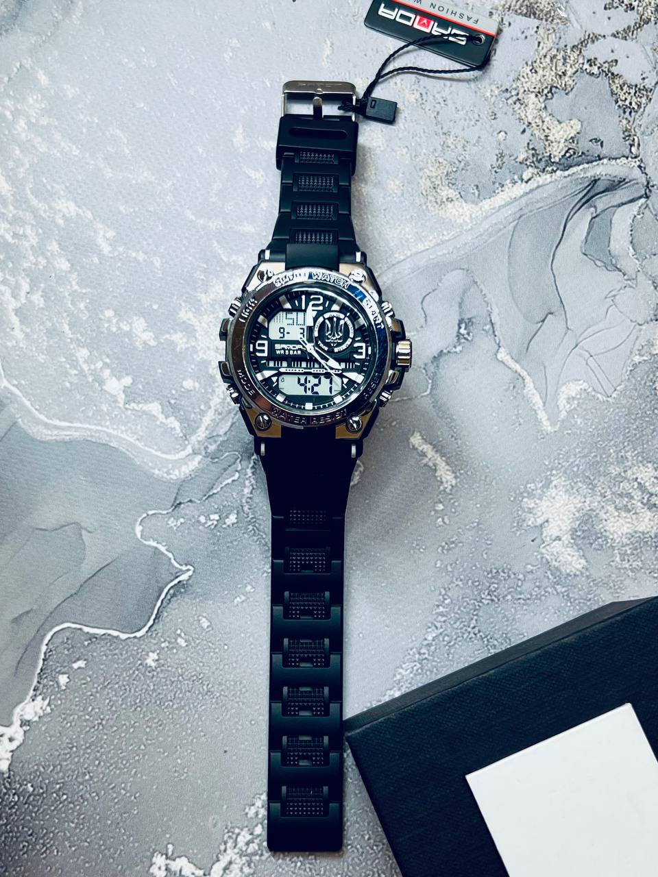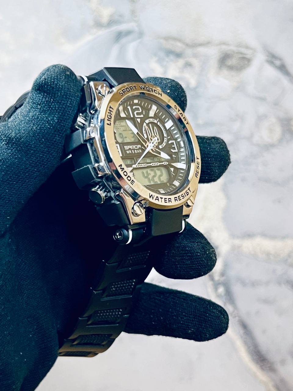 Функциональная модель для мужчин, предпочитающих активный ритм жизни, выполнена с комбинированным типом циферблата. В процессе эксплуатации все элементы: время, минута, секунда, дата, день недели, месяц, секундомер, таймер, будильник, подсветка работают бесперебойно.