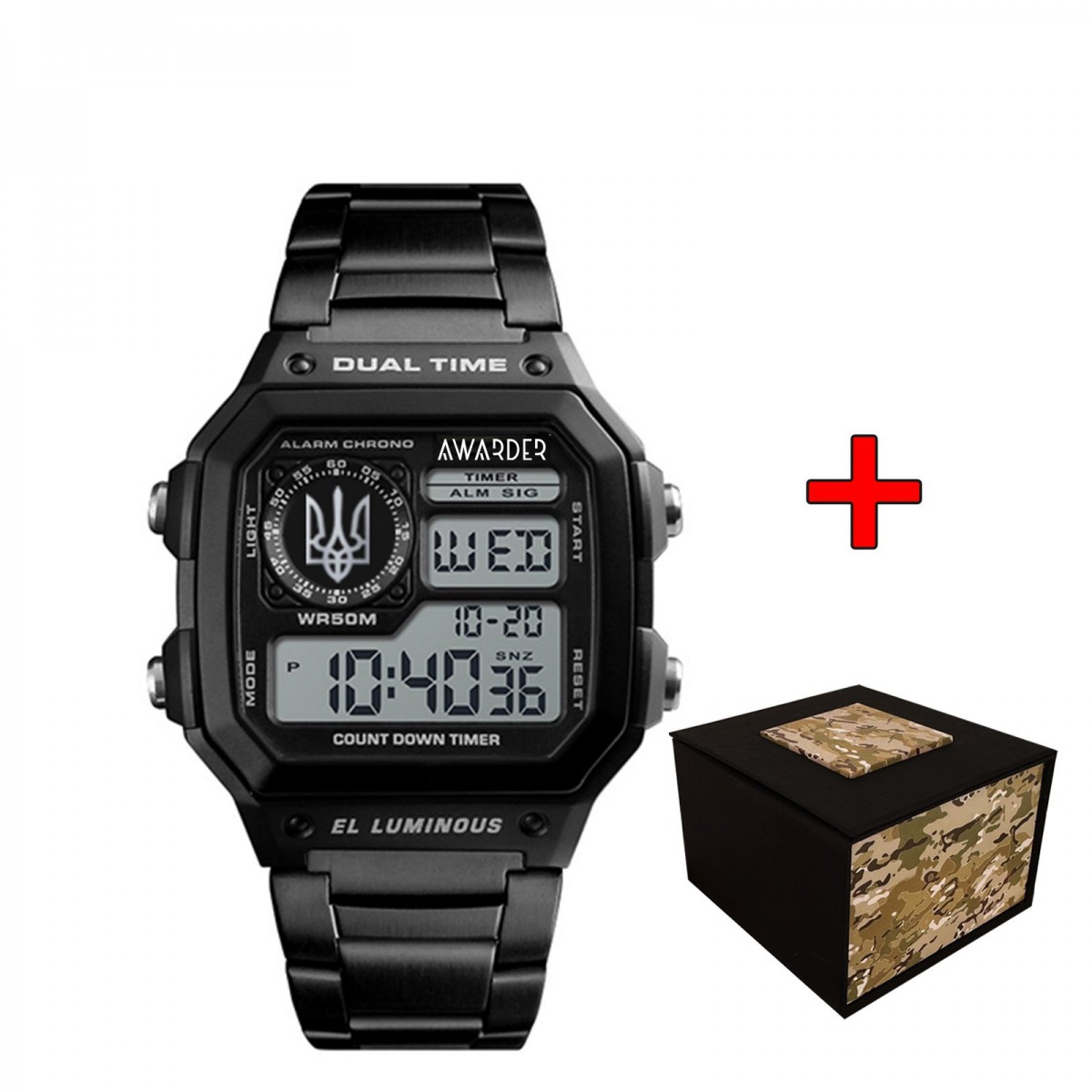Годинник має водонепроникність до 50 м, що дозволяє використовувати його під час різних активностей, включаючи плавання. Електронний циферблат з арабськими цифрами обладнаний електролюмінесцентною підсвіткою, що забезпечує легке читання в умовах низької освітленості. Ви також зможете насолоджуватися додатковими функціями, такими як будильник, календар, секундомір та можливість відображення другого часового поясу.