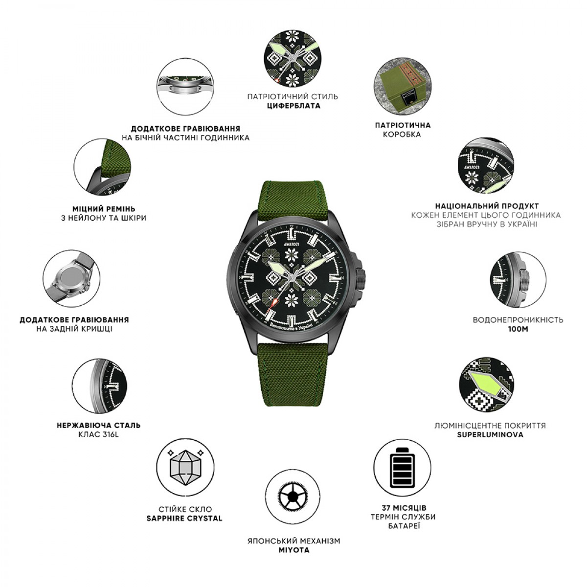 Опис Awarder Embroidery Silver-Green Khaki Battery 10ATM