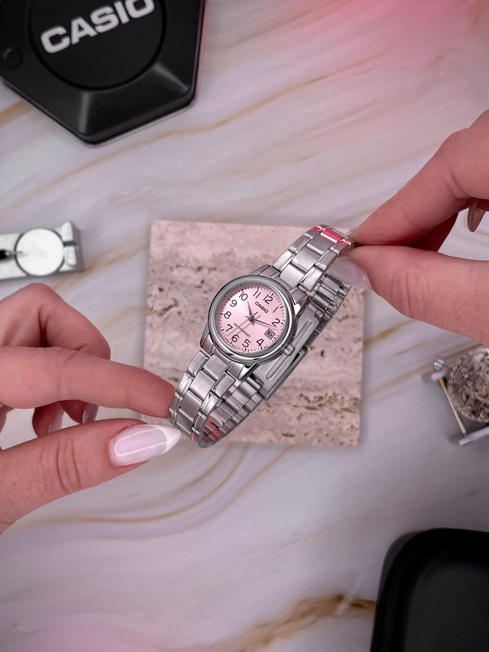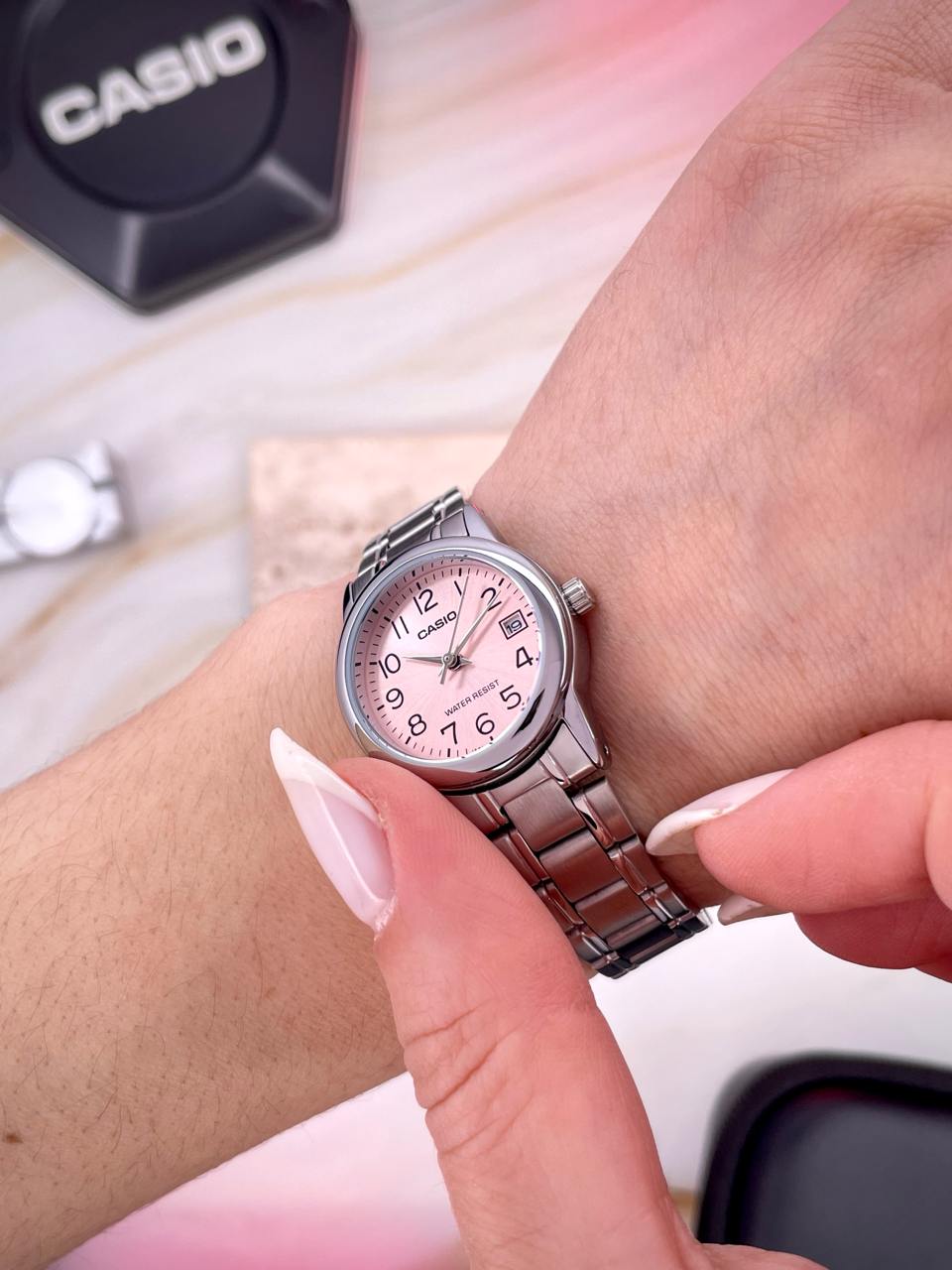 Годинник Casio LTP-V002D-4B - стильний та функціональний аксесуар для жінок, що поєднує сучасний дизайн і класичні елементи. Корпус з нержавіючої сталі надійний і довговічний, а ніжний рожевий циферблат доповнений легкими золотими акцентами, що надають йому елегантного вигляду. Чіткі цифри та стрілки забезпечують зручність в читанні часу.