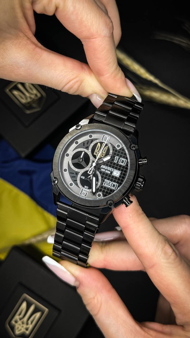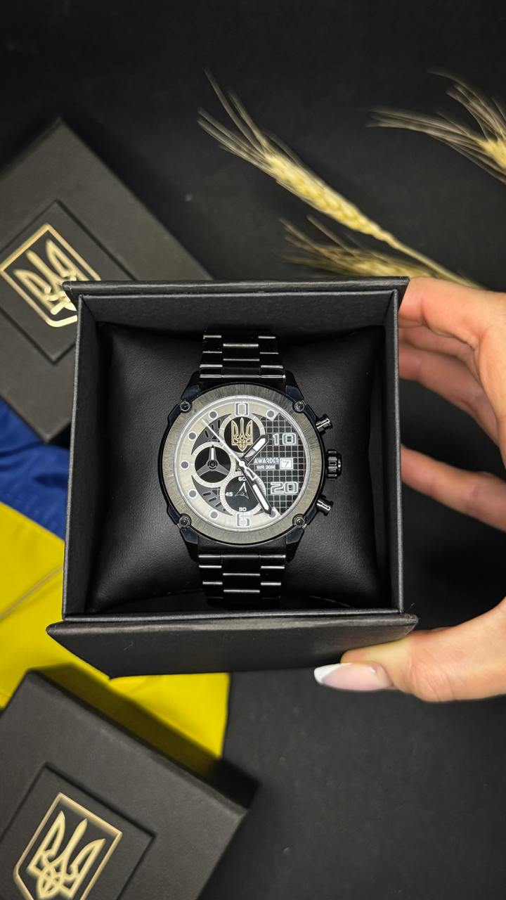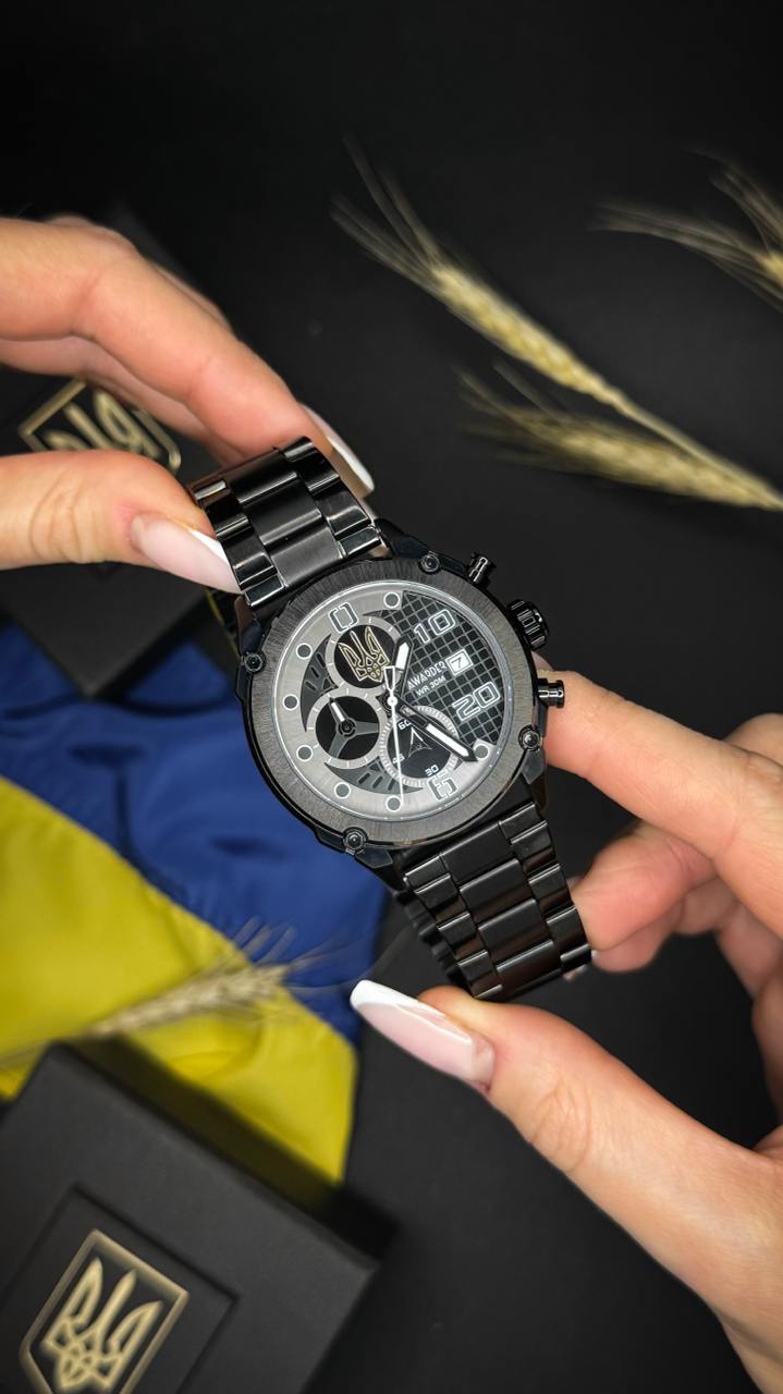 Дизайн циферблата виконаний у стриманому чорному кольорі з акцентом на національну символіку – державний герб України (Тризуб). Лаконічний стиль, чіткі цифри та додаткові індикатори надають годиннику брутальності й елегантності водночас.