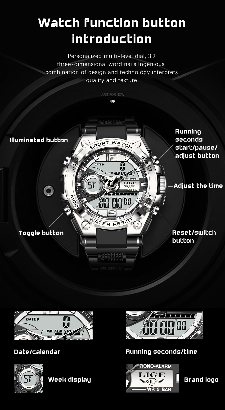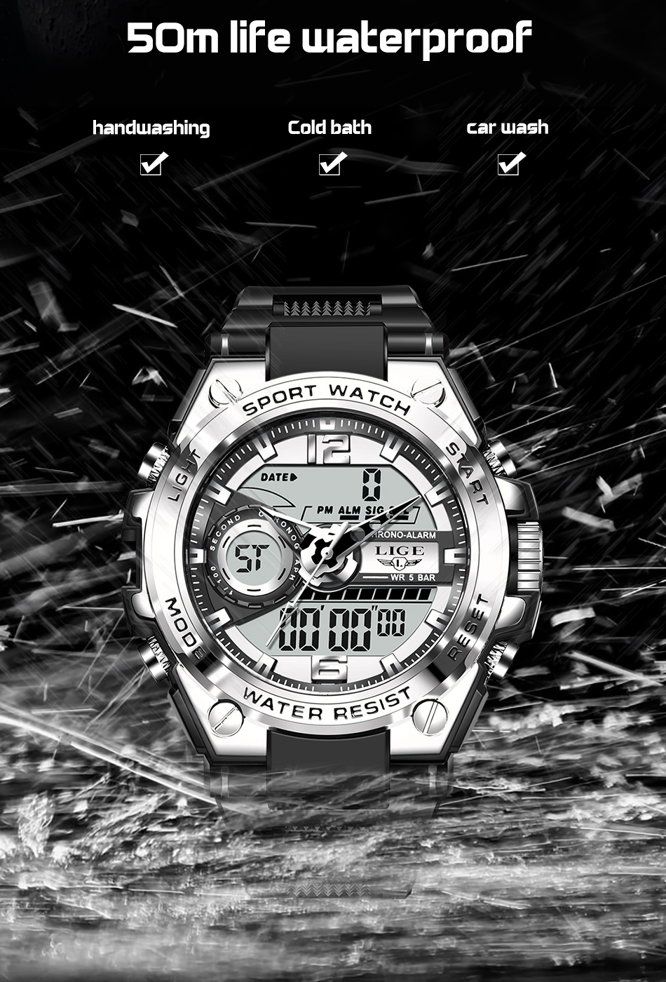 Lige Sport – преміальна тактична спортивна модель заводу Lige. Годинник має підвищену ударостійкість, не бояться води і підійде під будь-який стиль. Всі годинники Lige мають стандарт якості ICO:9001. Також годинник комплектується японським механізмом і має офіційну гарантію 12 місяців.